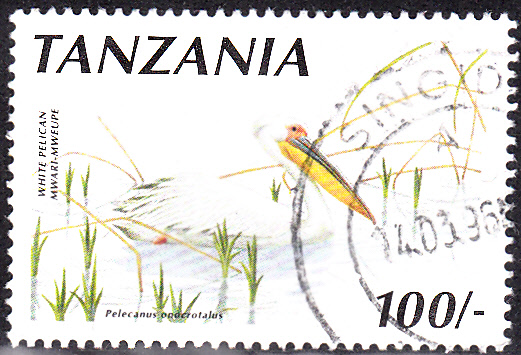 Aus Tansania kommt diese Marke (MiNr 743) mit einem Rosapelikan (Pelecanus onocrotalus).