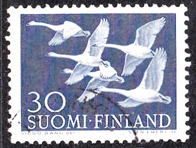1956 sind in den skandibavischen Ländern Gemeinschaftsmarken "NORDEN" erschioenen, die jeweils fünf fliegende Singschwäne (Cygnus cygnus) zeugen. Hier die 25 Öre-Marke aus Schweden (MiNr 416).