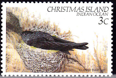 Diese Marke der Weihnachtsinsel (MiNr 156) bildet einen brütenden Weihnachts-Insel Glanzkopfsalangan (Collocalia esculenta natalis) ab auf seinem Nest.