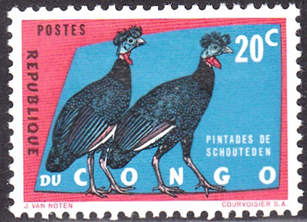 Auf dieser Marke (MiNr 139) aus dem Kongo (Kinshasa) werden zwei Kräuselhauben-Haubenperlhühner (Guttera pucherani) gezeigt.