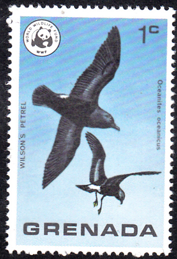 Auf dieser Marke aus Grenada (MiNr 882) sind zwei Buntfuß-Sturmschwalbe (Oceanites oceanicus) im Flug zu sehen.