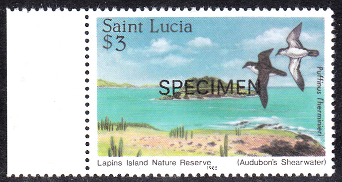 In einer Serie "Naturschutz" aus St. Lucia ist eine Marke (MiNr 774) mit zwei Schuppensturmtaucher (Puffinus lherminieri) im Flug erschienen. Im Michel wird er Audubon-Sturmtaucher (Puffinus Iherminieri), nach dem amerikanischen Ornithologen John James Audubon, genannt. Hier zeige ich eine Mustermarke.