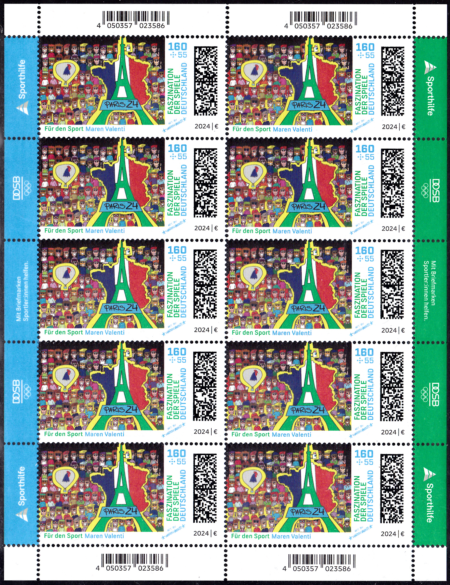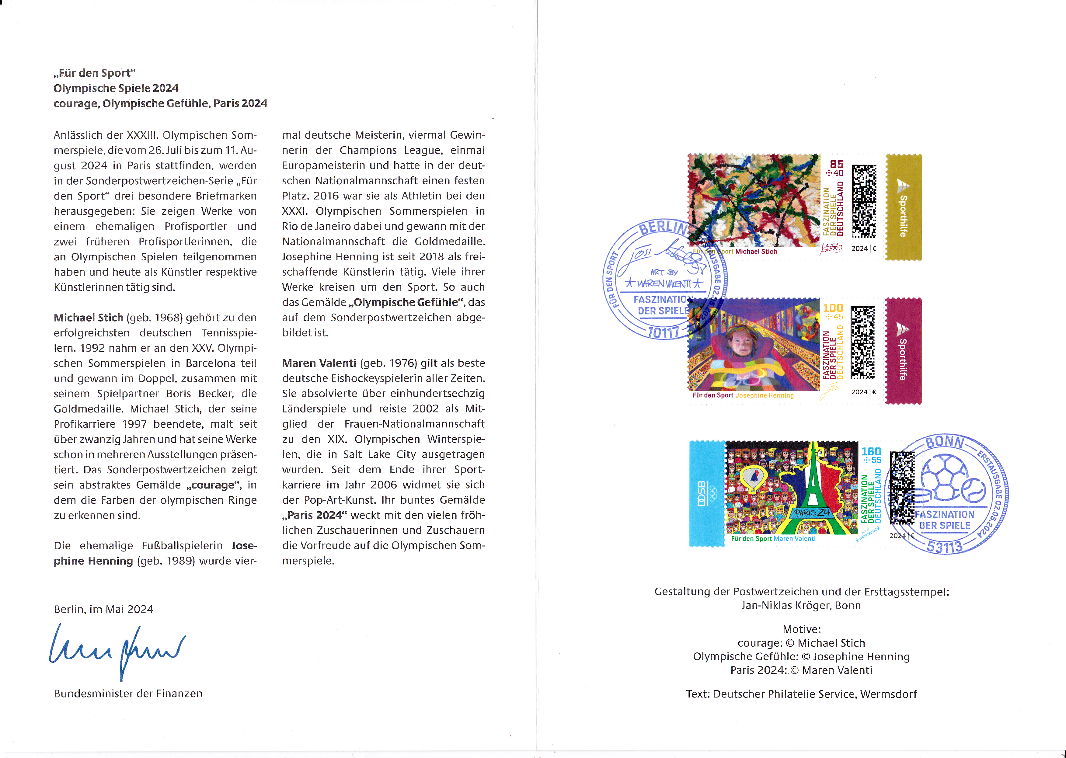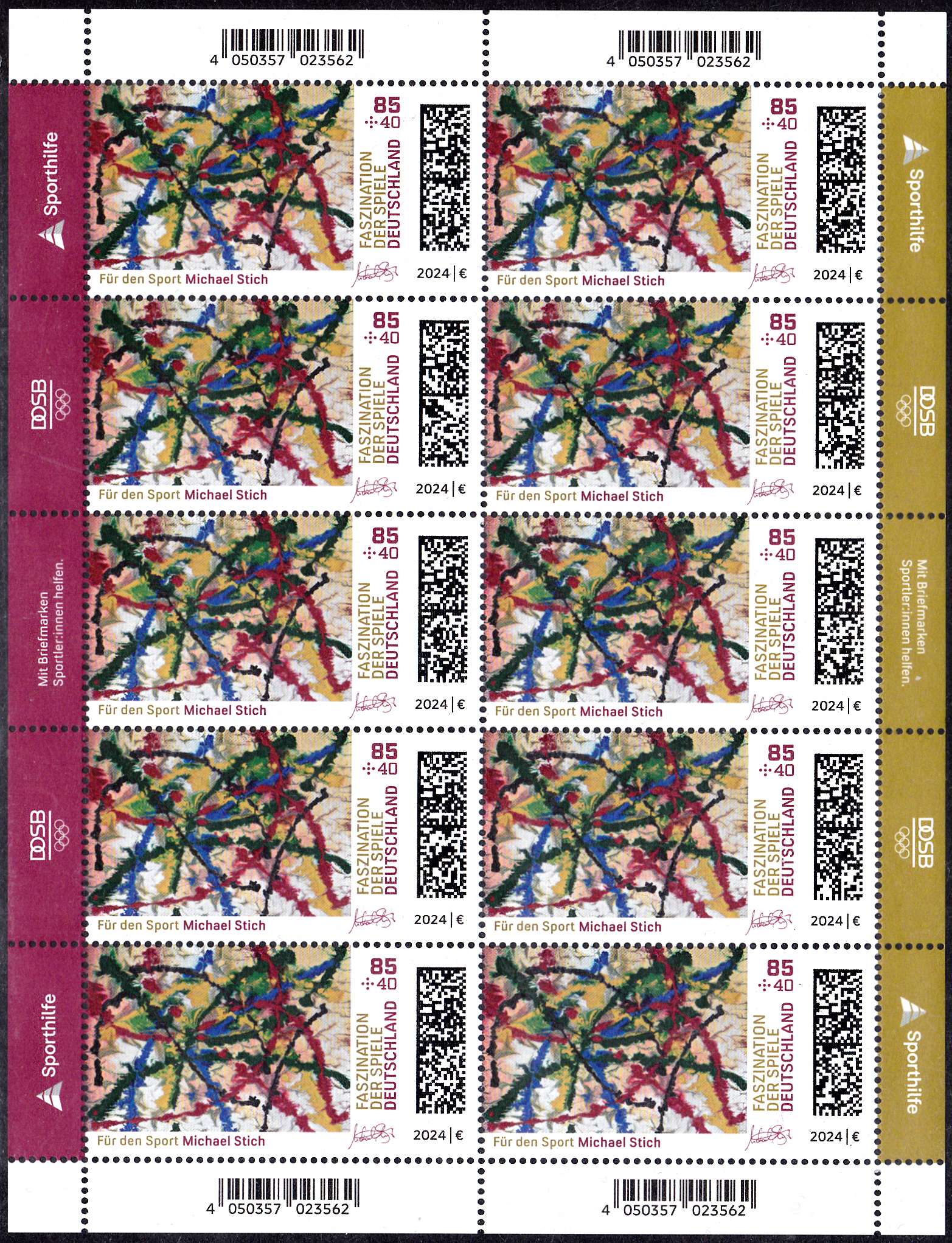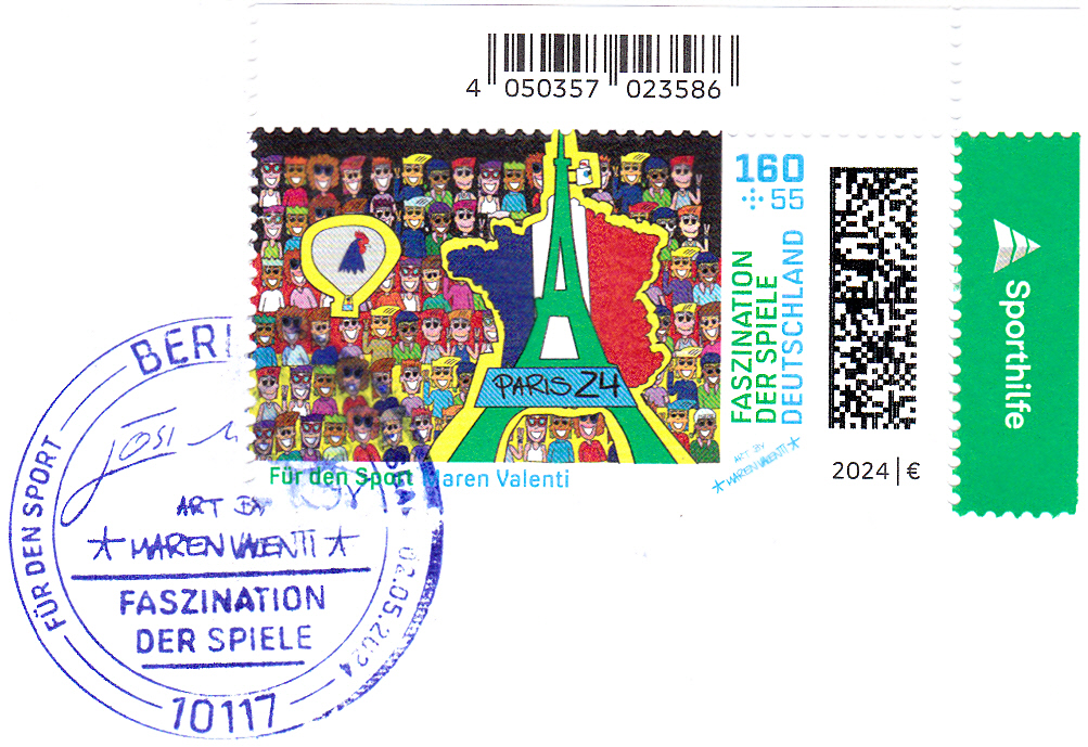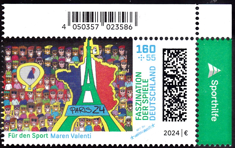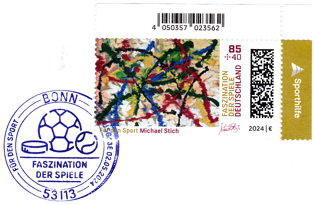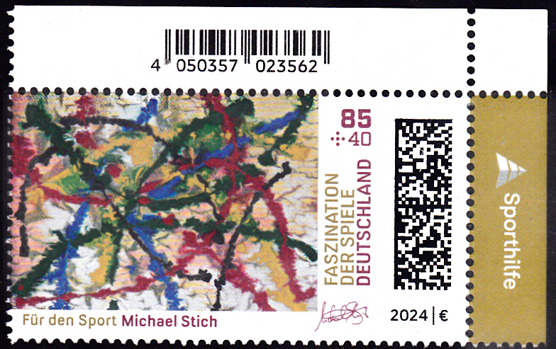 Bei der Deutschen Post erschienen die Zuschlagsmarken für die Sporthilfe zu den Olympischen Spiele 2024 in Paris. Sie zeigen Gemälde von deutschen Olympiateilnehmer. Auf der Marke zu 85+40 Cent ist das Gemälde "courage" von Michael Stich (geb. 1968; deutscher Tennisspieler und zusammen mit Boris Becker Olympiasieger) abgebildet.