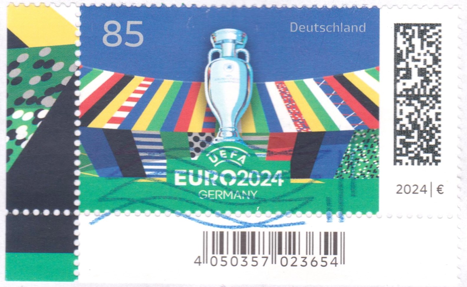 Bei der Deutschen Post ist eine Marke (MiNr 3835) mit dem Henri-Delaunay-Pokal vor einer Stadionkulisse zur EM 2024 erschienen. Hier zeige ich eine Marke vom Eckrand mit EAN-Codierung.