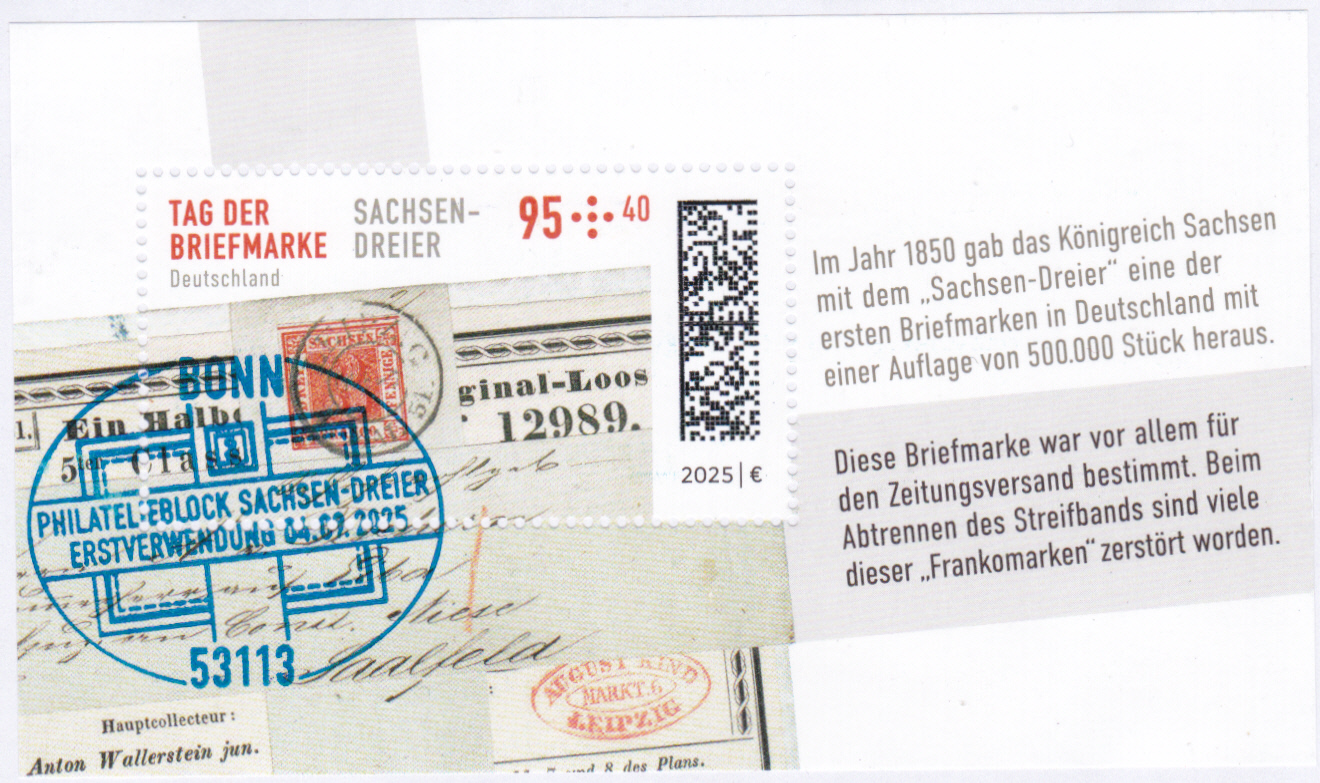 Am 4. September 2025 erschien bei der Deutschen Post eine Marke (MiNr 3923) zum Tag der Briefmarke 2025. Sie zeigt die Freimarke Sachsen MiNr. 1 vom 1. Juli 1850 auf Streifband, gestempelt am 4. Mai 1851 in Leipzig. Hier zeige ich eine Marke vom Eckrand mit EAN-Codierung.