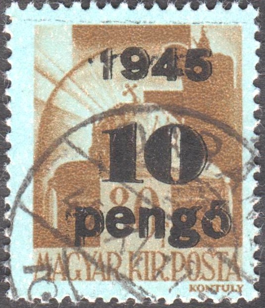Diese Freimarke, Ungarn MiNr. 778, erschien am 01.06.1945, indem eine Neuauflage der Freimarke Ungarn MiNr. 708, 10 f dunkelbraun auf blau gefärbtem Papier, mit einem Aufdruck in Rot "1945 10 filler" versehen wurde: