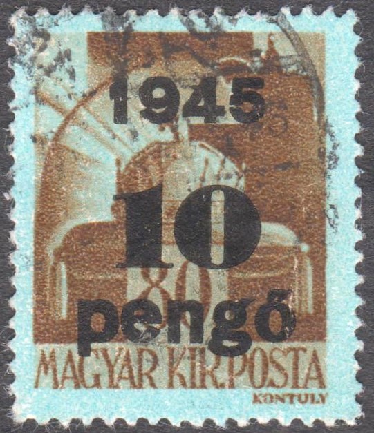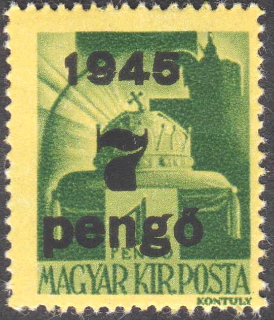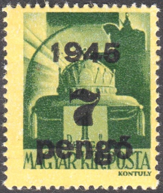 Diese Freimarke, Ungarn MiNr. 797, erschien am 18.07.1945, indem eine Neuauflage der Freimarke Ungarn MiNr. 715, 20 f dunkelrotbraun auf gelb gefärbtem Papier, mit einem Aufdruck in Schwarz "1945 1 pengö" versehen wurde: