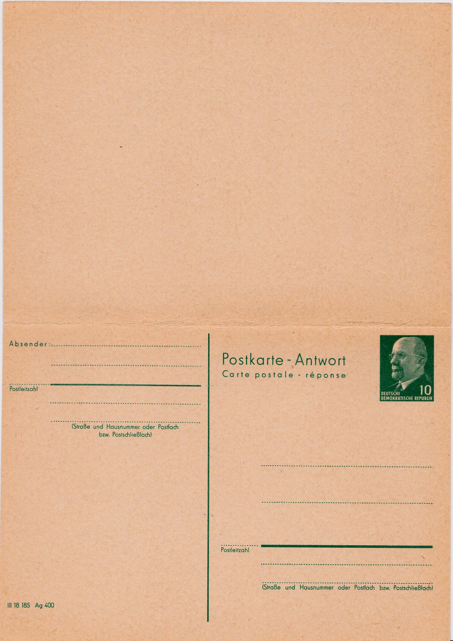 Postkarte mit Antwortkarte mit Wertstempel 10Pf Ulbricht mit Postleitzahl im Absender- und Empfängerteil (MiNr P77). Hier ein ungebrauchtes Exemplar mit zusammenhängendem Frage- und Antwortteil.