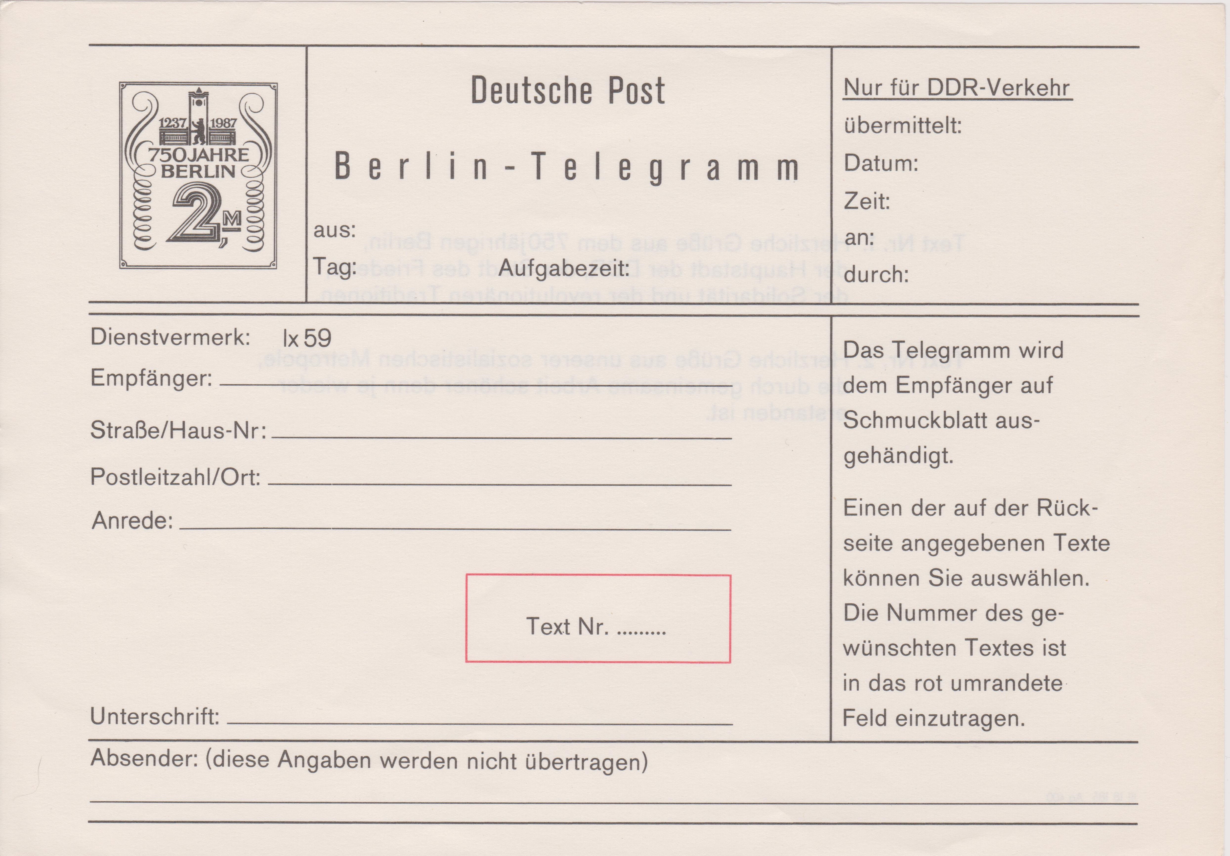 Dieses einzigartige Telegrammblatt erschien 1987 anlässlich des Berlin-Jubiläums mit einer eingedruckten Wertmarke zu 2 Mark. Nach dem Erwerb eines Telegrammblattes konnte man zwischen zwei vorgegebenen Grußtexten wählen und deren Text-Nr. eintragen. Der Grußtext wurde dann von der Post in einem besonderen Schmuckblatt dem Empfänger zugestellt. Das aufgegebene Telegrammblatt verblieb als Nachweis bei der Post. Daher kommen diese Telegrammblätter nur in ungebrauchter Erhaltung vor.