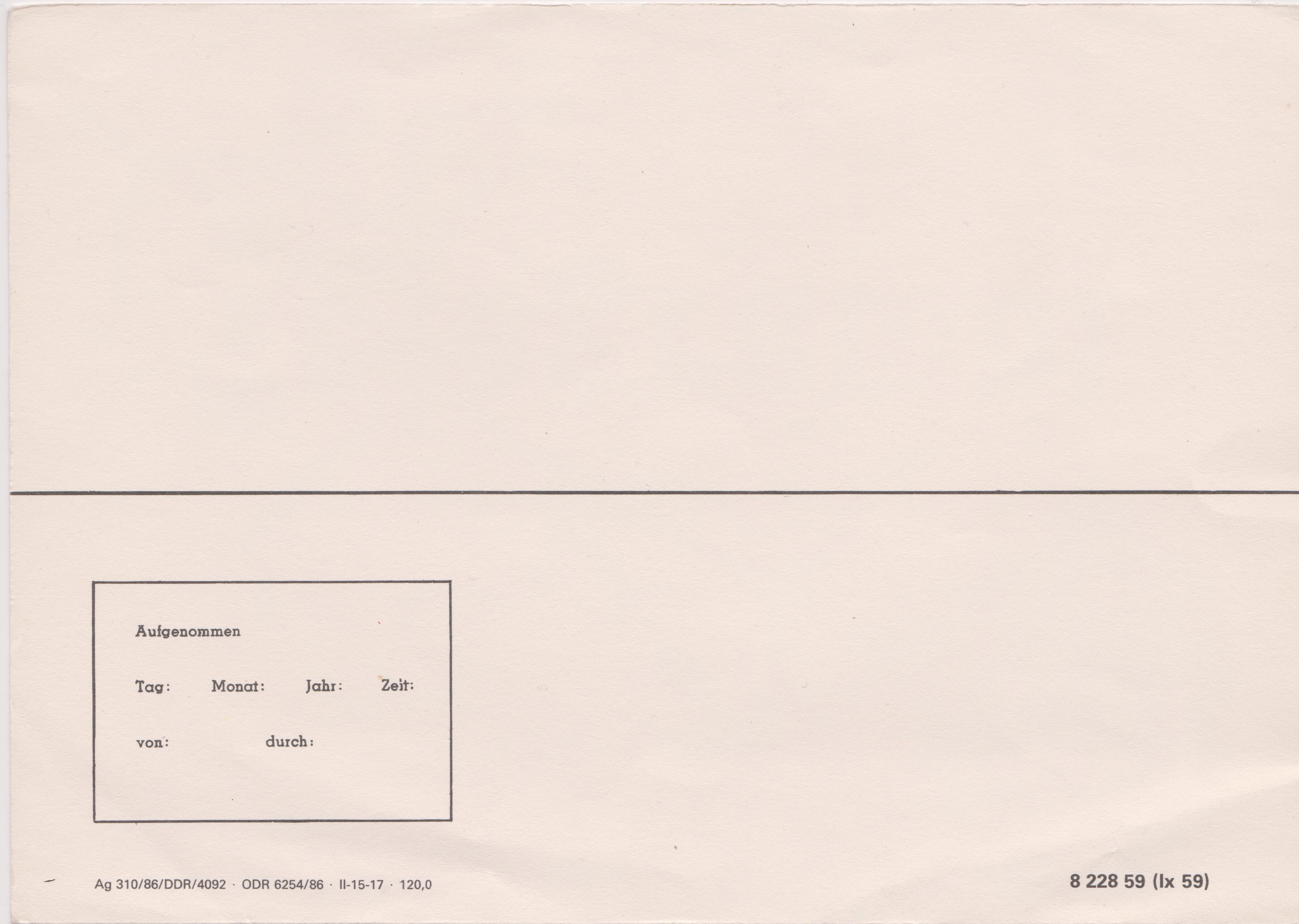 Schmuckblatt-Telegramm "lx 59" mit Druckvermerk "Ag 310/86/DDR/4092 · ODR 6254/86 · II-15-17 · 120,0 8 228 59 (lx 59)"