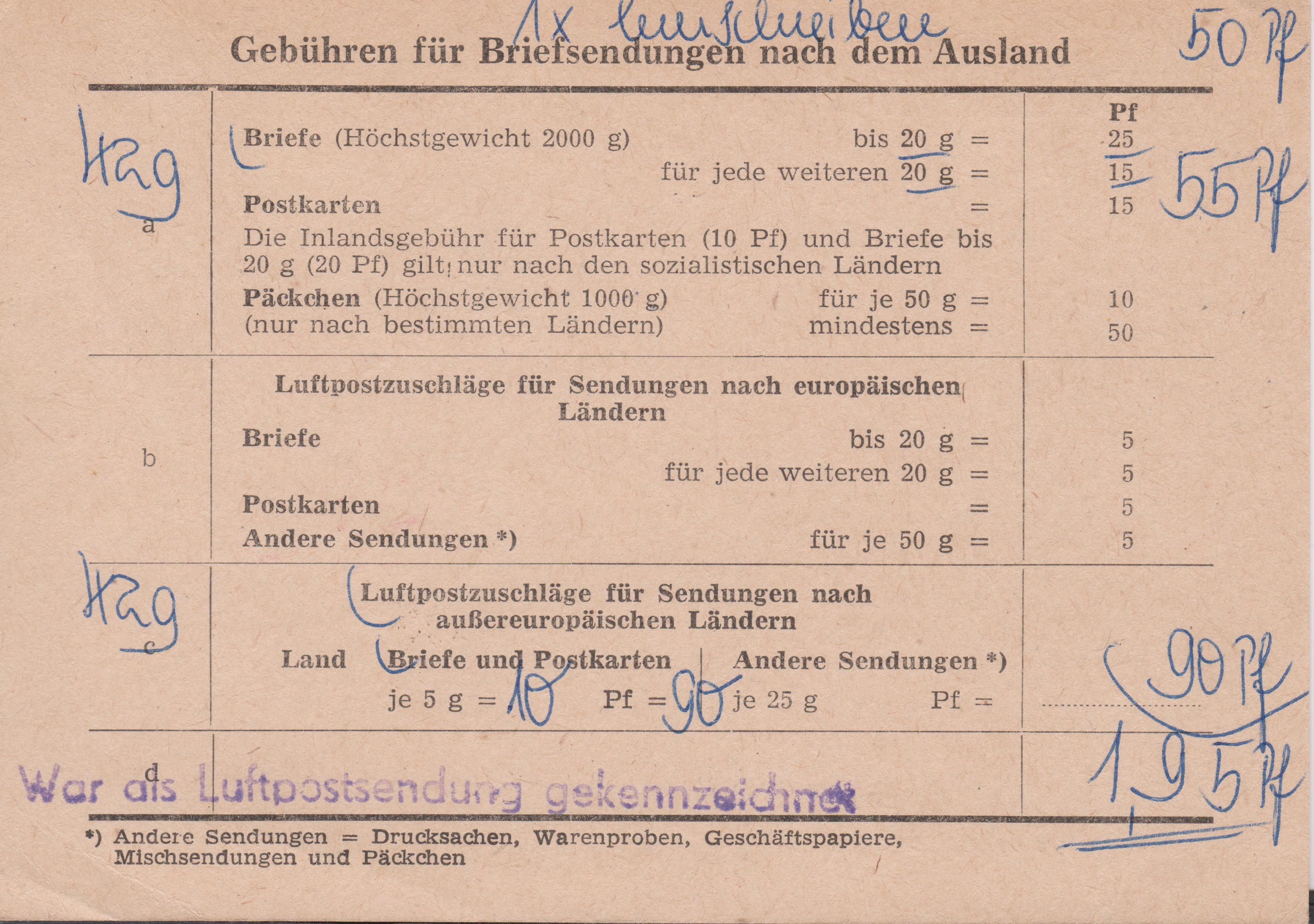 Bei einer postinternen Nachprüfung wurde festgestellt, dass dieser Brief 42 g wog und somit in die Portostufe 195 Pf einzuordnen war.