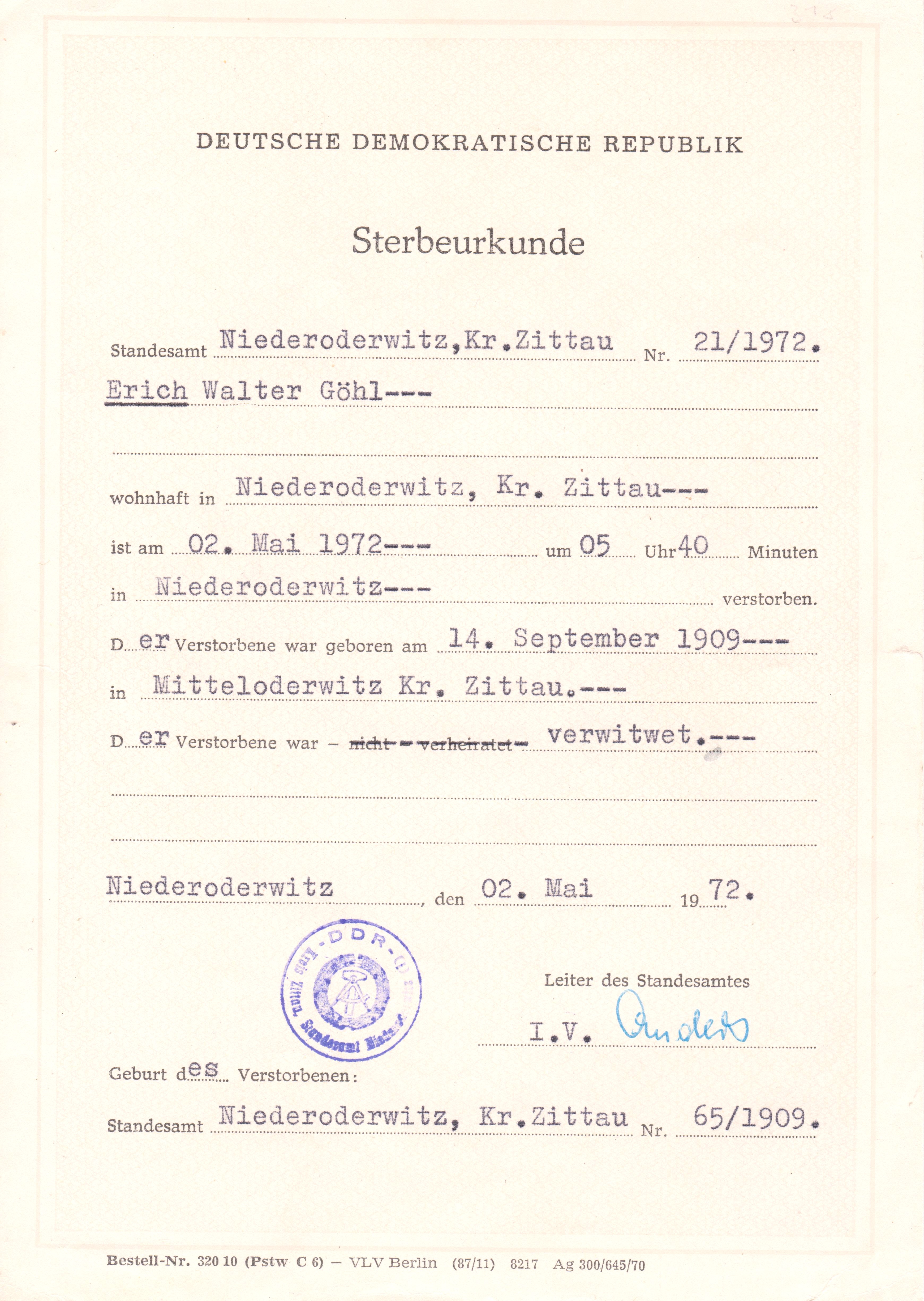Gebührenmarke "-,60 M Verwaltungs-gebühr" am 02.05.1972 rückseitig auf Sterbeurkunde aus Niederoderwitz: