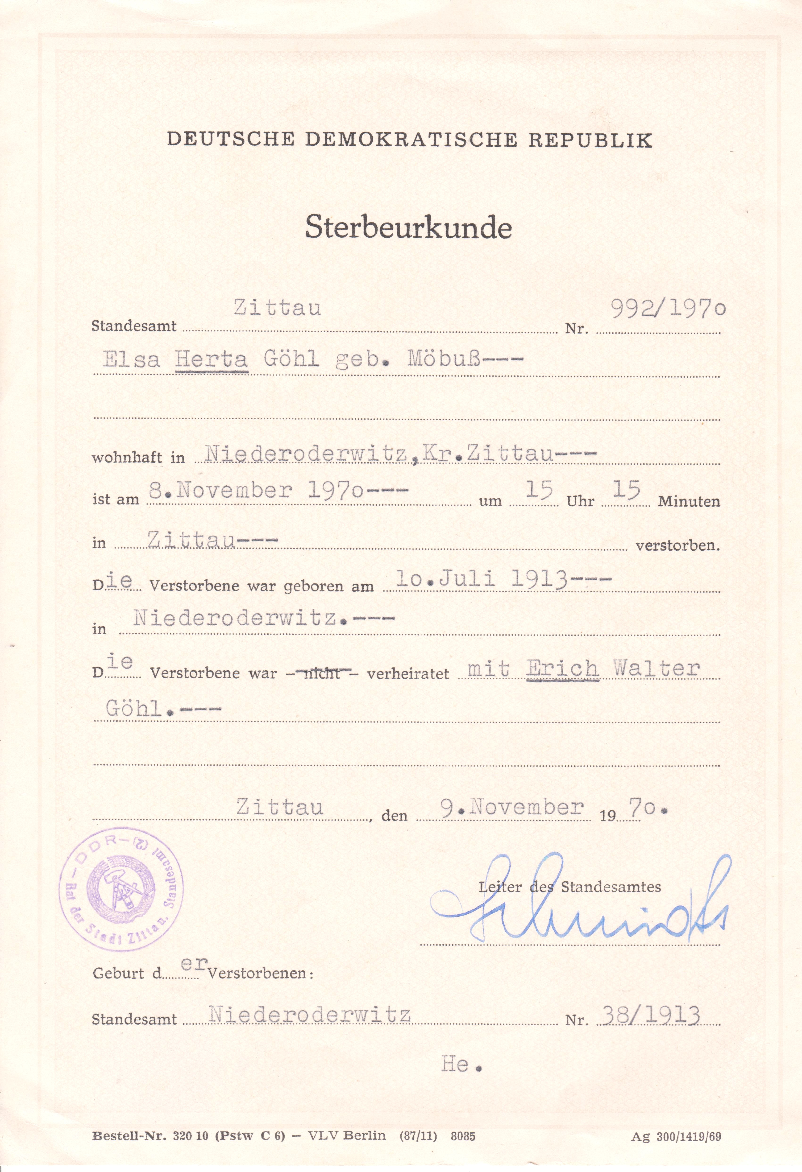 Gebührenmarke "-,60 M Verwaltungs-gebühr " am 09.11.1970 rückseitig auf Sterbeurkunde:
