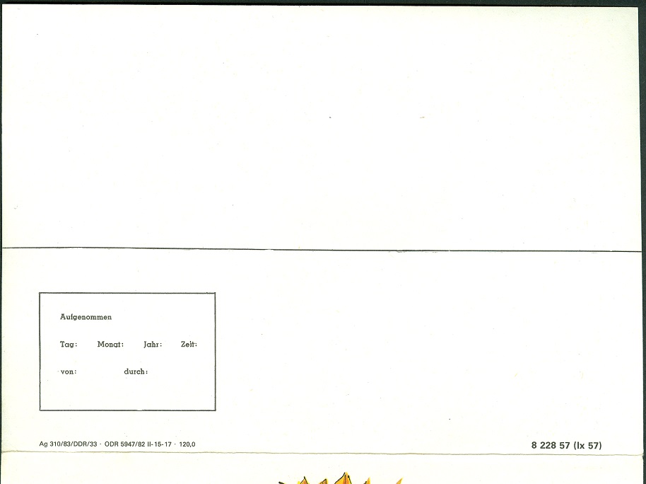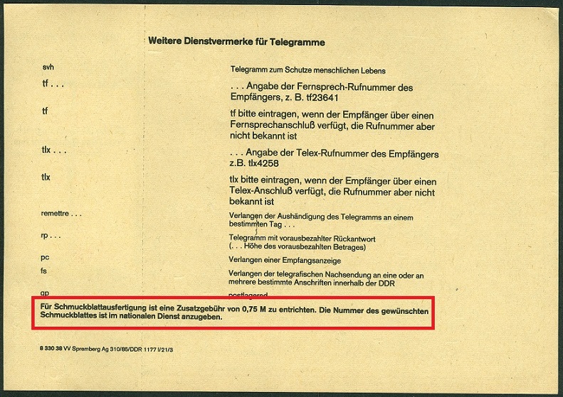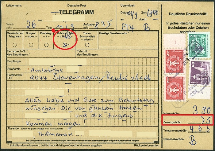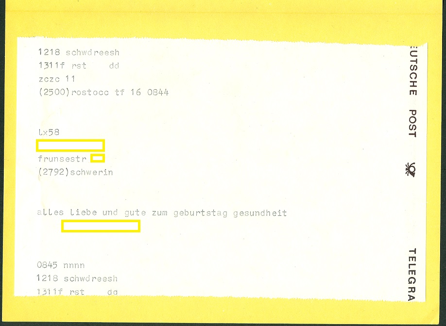 Und zugeklebt wurde es dann dem Empfänger ausgehändigt oder bei Nichtantreffen des Empfängers in einen vorhandenen Hausbriefkasten eingeworfen. (Exemplar laut Druckvermerk und Telegramm-Text aus dem Jahr 1985)