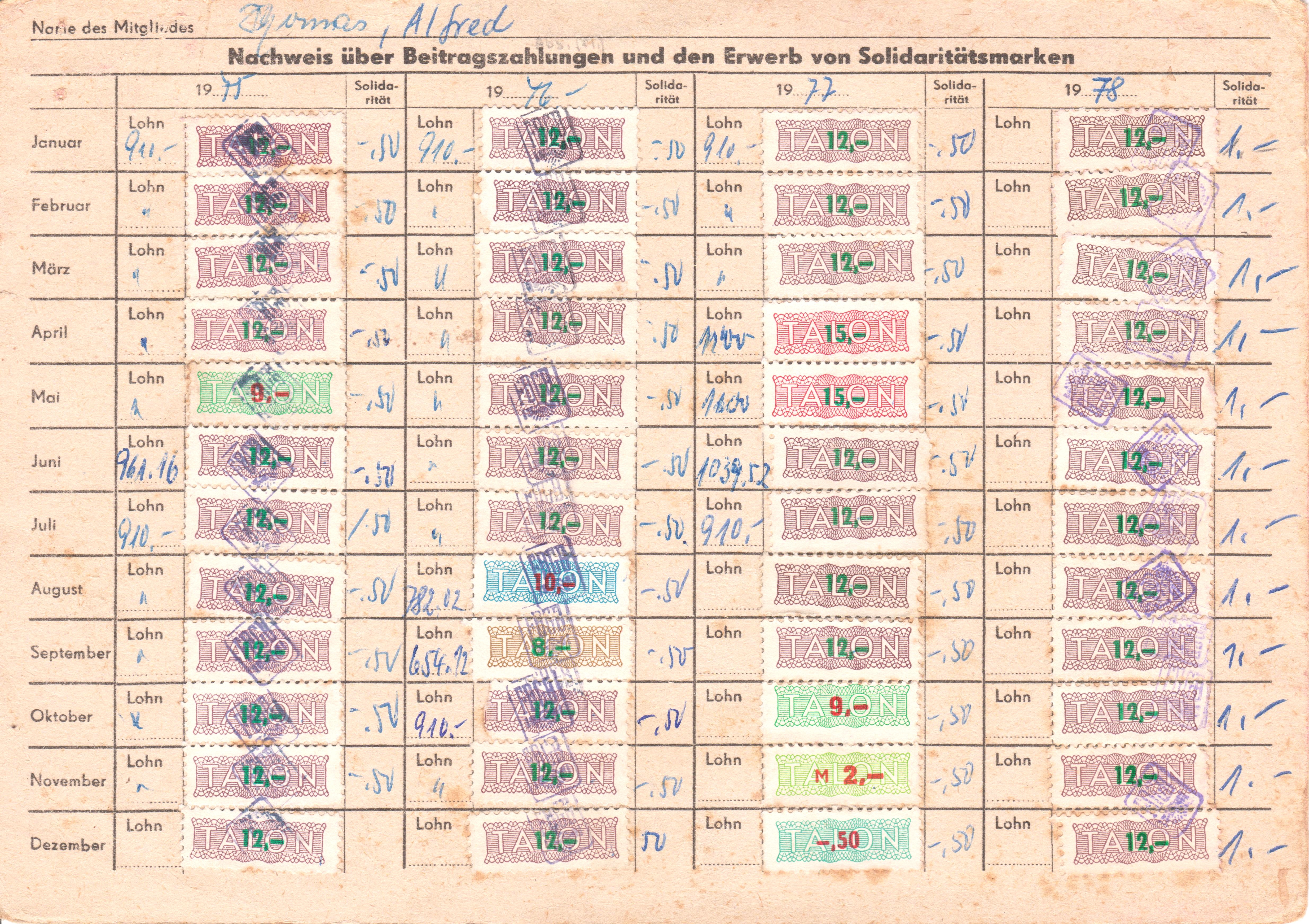 Diese Beitragsmarken wurden im FDGB-MITGLIEDSBUCH verklebt in der Rubrik "Solidaritätsmarke".