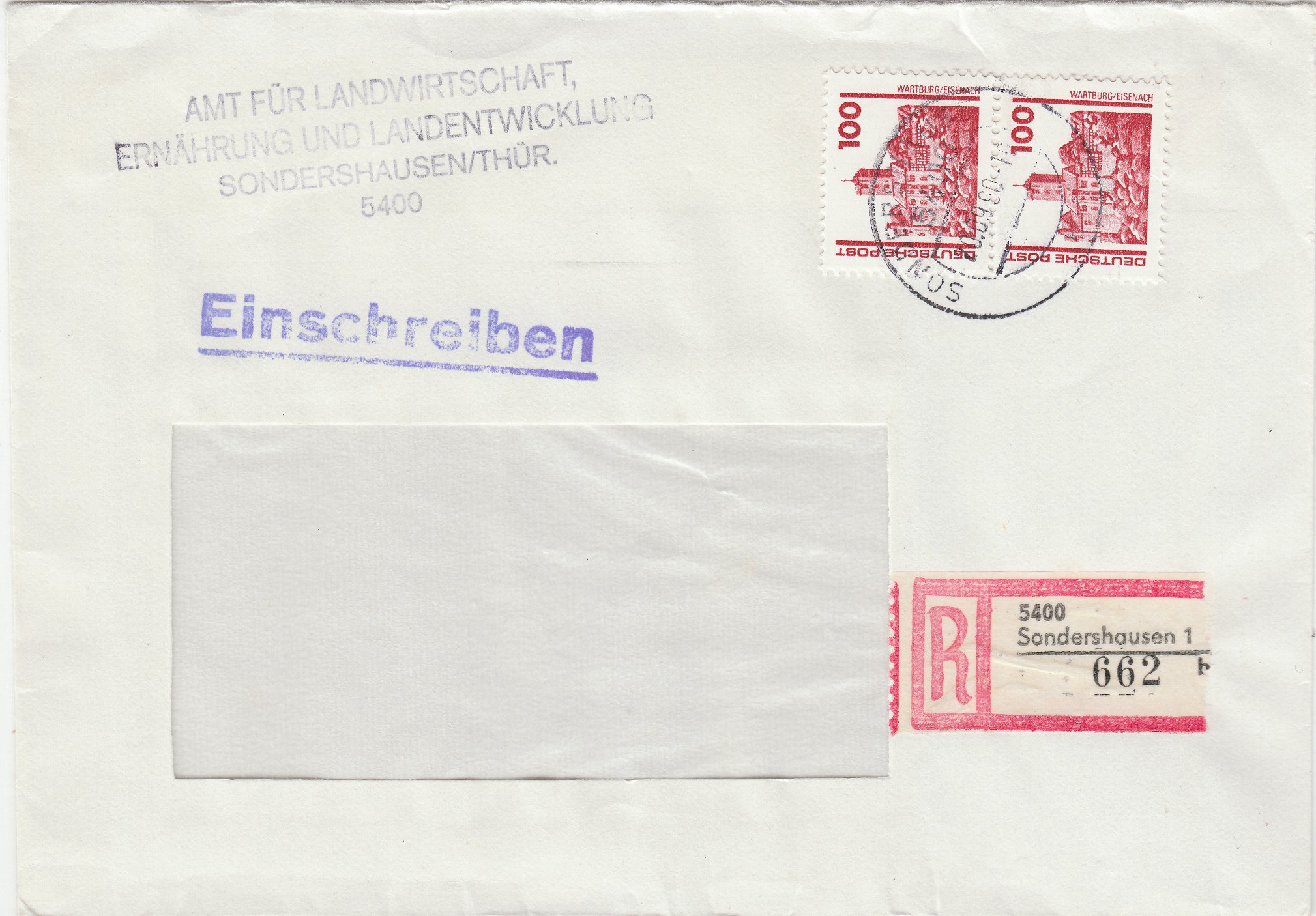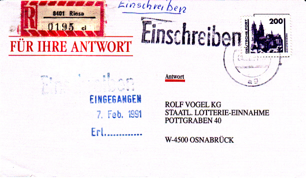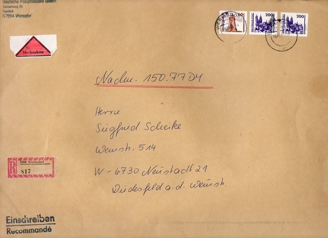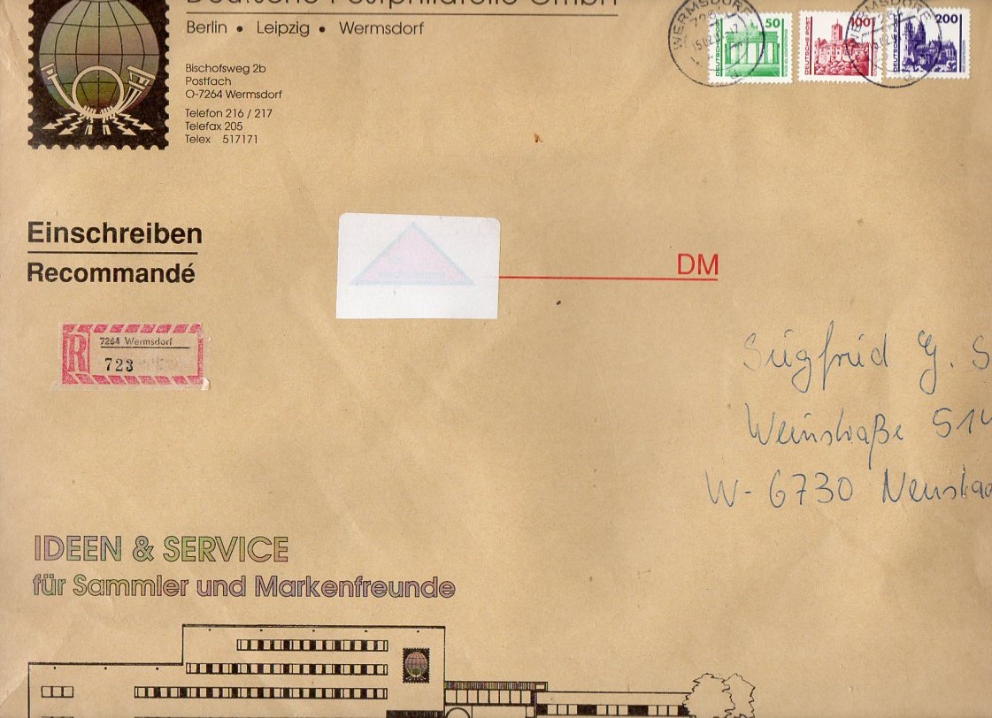 Auch dieser Brief kann nur von einem Briefmarkensammler stammen, mit Einführung der DM wurde bei allen Selbstbedienungs-Einschreibe-Automaten der Geldeinwurf verklebt, so das ein SB-Einschreiben nicht mehr möglich war. Trotzdem wurden die entrichteten 50 Pfg (-Ost) bei diesem Beleg anerkannt, da ja auch die DDR-Marken noch frankaturgültig waren.