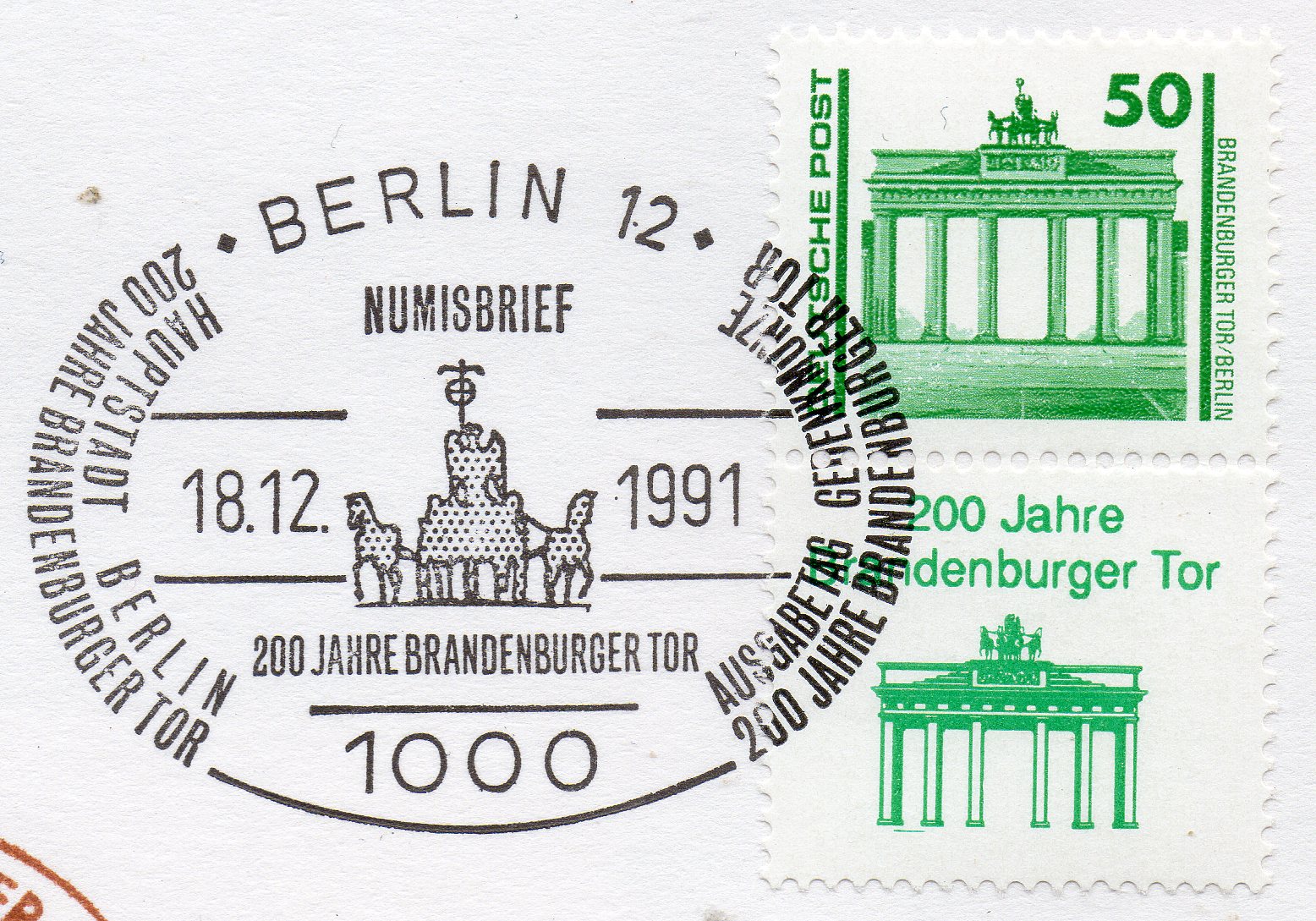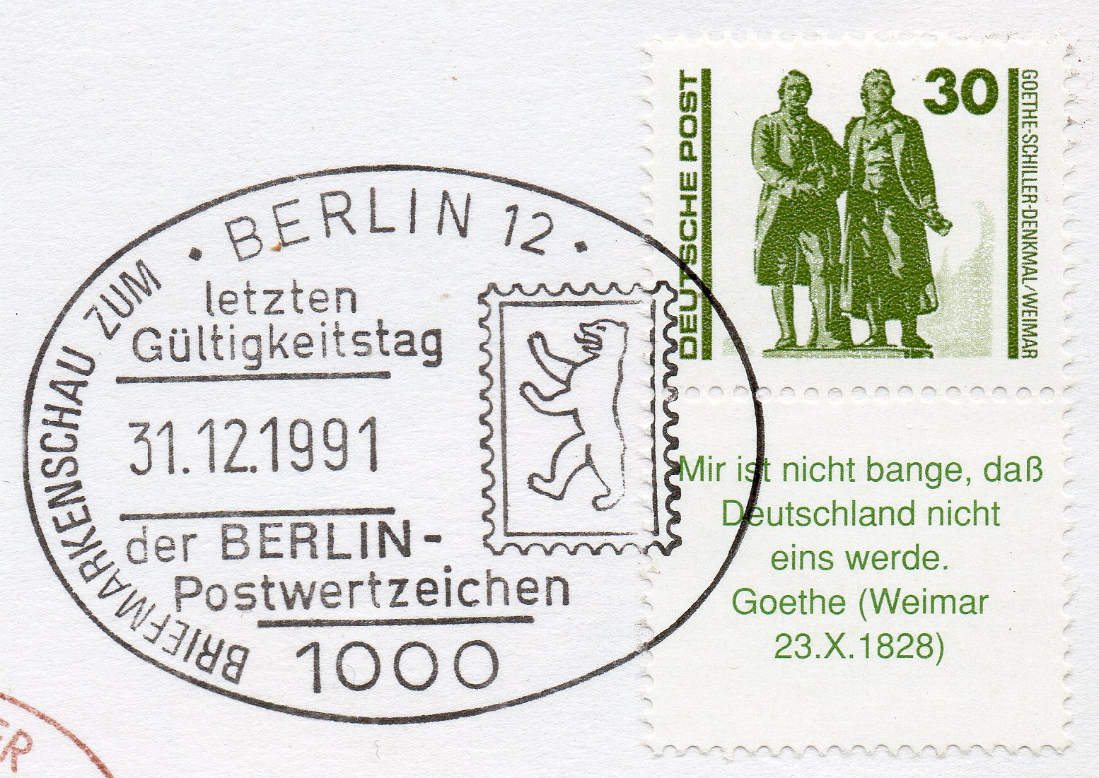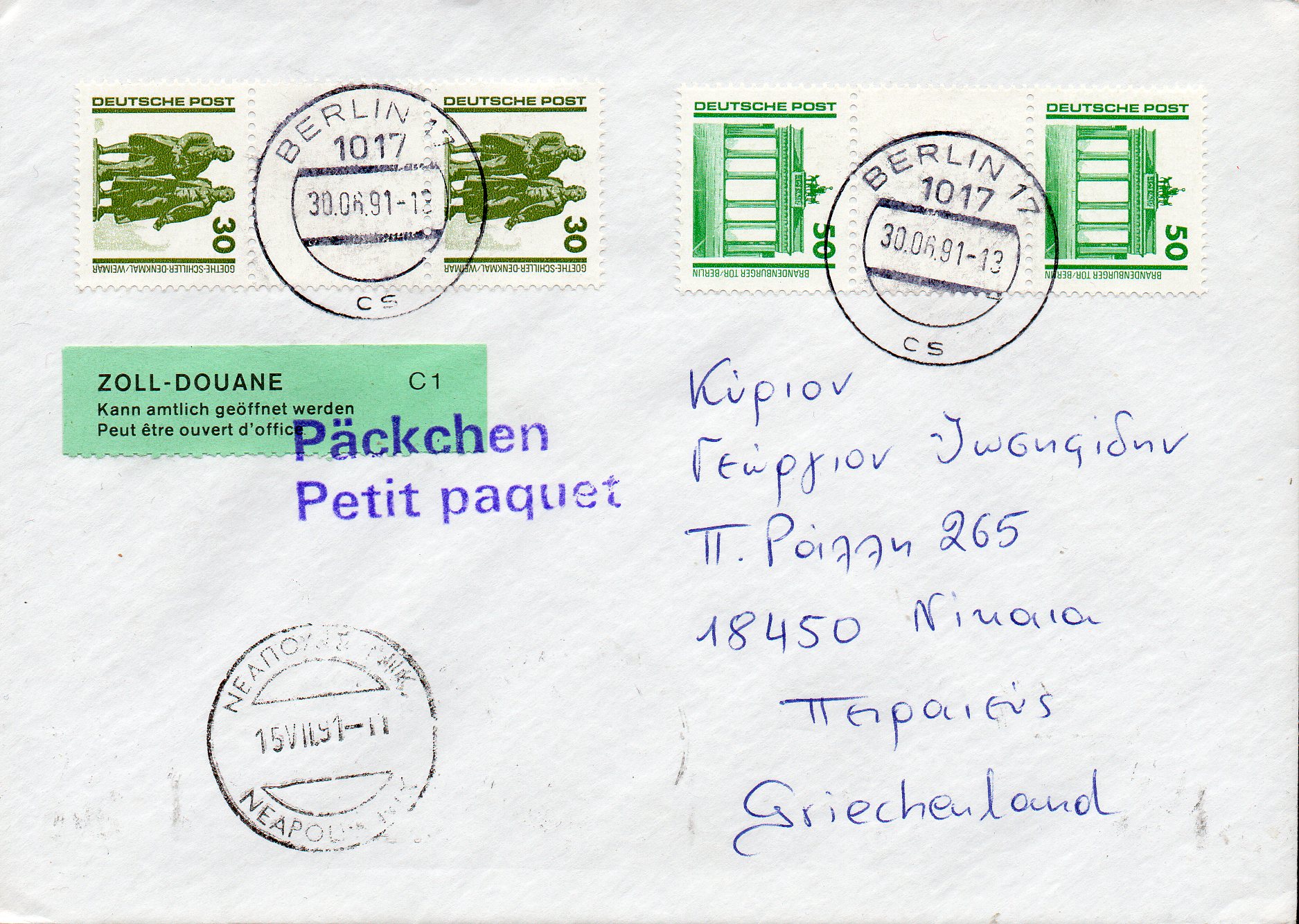 Auch dieser Brief kann nur von einem Briefmarkensammler stammen, mit Einführung der DM wurde bei allen Selbstbedienungs-Einschreibe-Automaten der Geldeinwurf verklebt, so das ein SB-Einschreiben nicht mehr möglich war. Trotzdem wurden die entrichteten 50 Pfg (-Ost) bei diesem Beleg anerkannt, da ja auch die DDR-Marken noch frankaturgültig waren.
