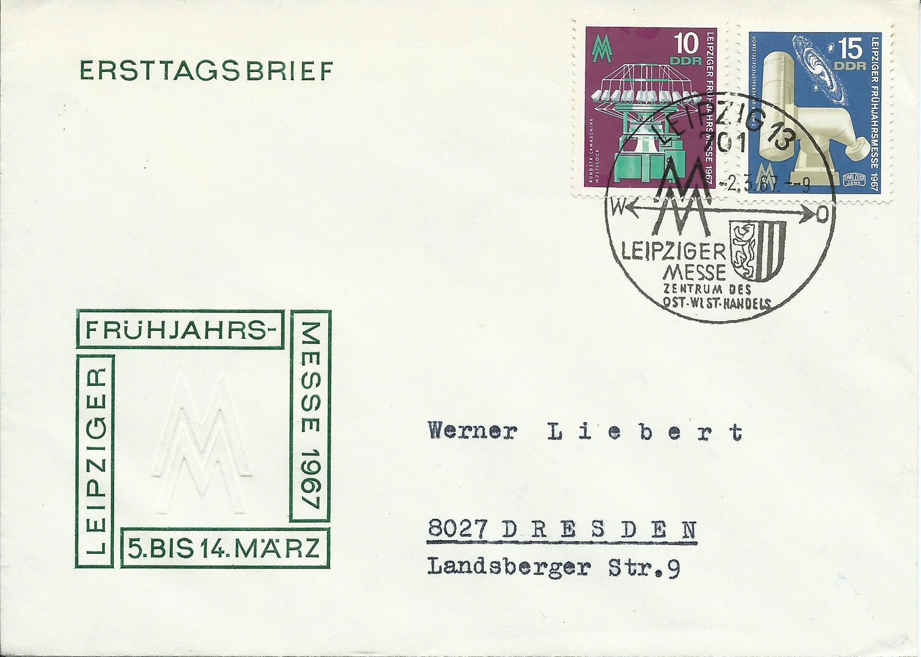 Beginnen wir mit der Leipziger Frühjahrsmesse 1967. Hier sehen wir die beiden Marken zu 10 und 15 Pf auf einem gelaufenen Ersttagsbrief, gestempelt wurde mit dem passenden Sonderstempel Leipzig 2.3.67.