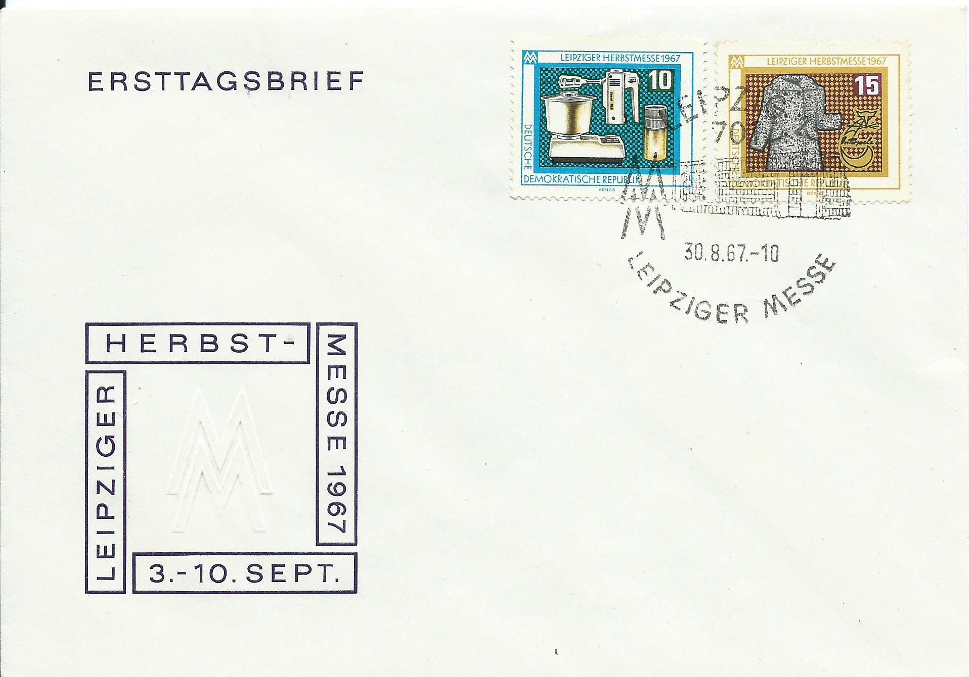Die beiden Ausgaben zur Herbstmesse 1967 habe ich hier auf einem Blanko-Ersttagsbrief, gestempelt mit dem passenden Sonderstempel Leipzig am 30.8.67.