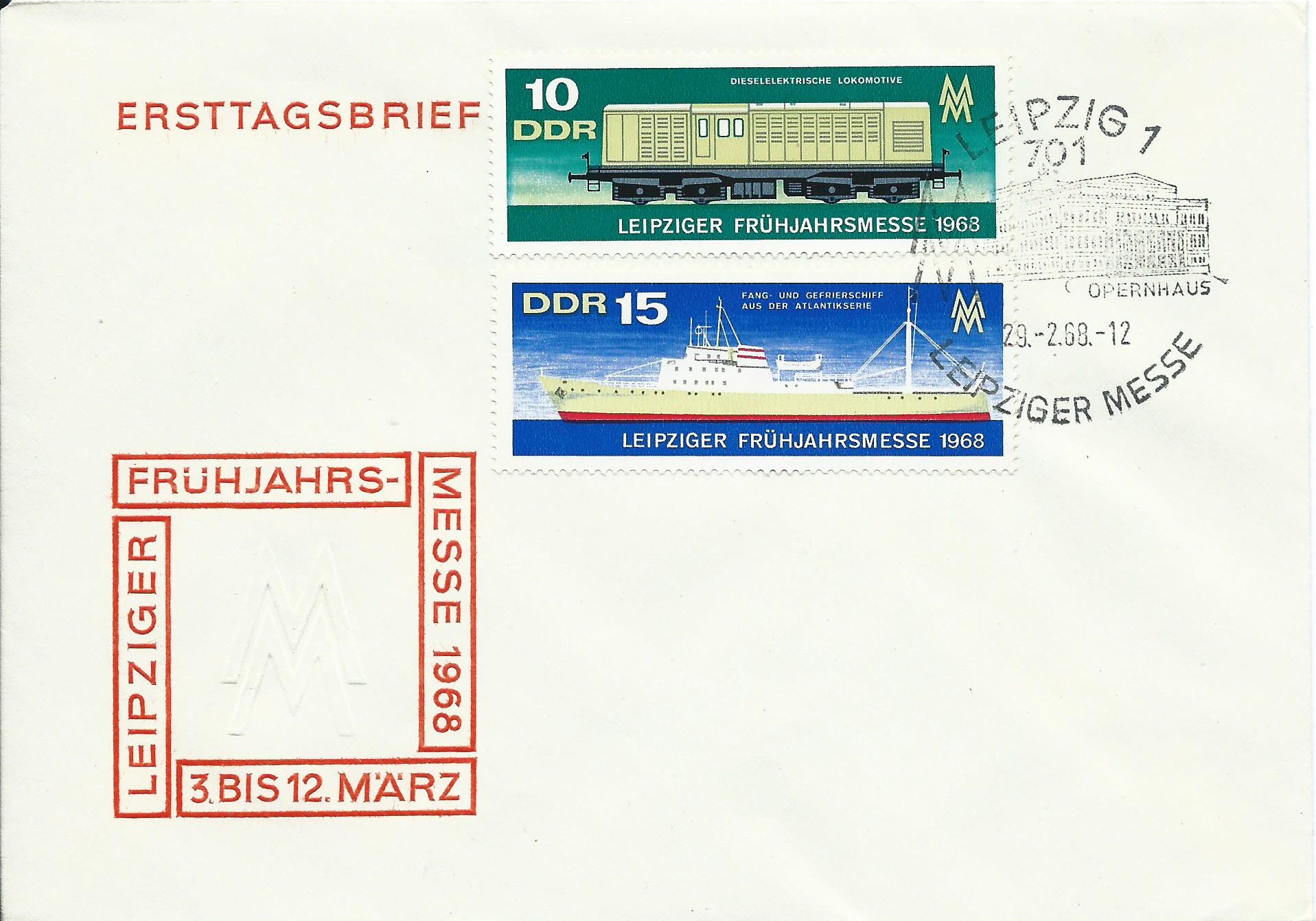 Zur Frühjahrsmesse 1968 gab es wierderum 2 Werte, hier auf einem Blanko-Ersttagsbrief, gestempelt mit dem passenden Sonderstempel Leipzig am 29.2.68. Aha, 29.2.? Also Schaltjahr!
