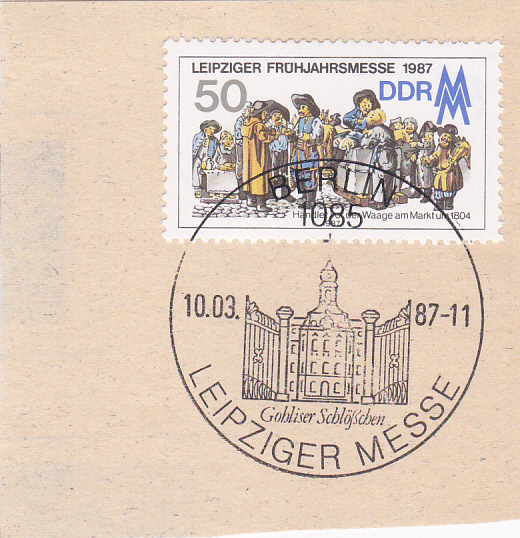 Die hier bereits von Matthias gezeigte Marke zur Leipziger Frühjahrsmesse (MiNr 3080) zeige ich auf einem Briefstück mit Ersttagsonderstempel Berlin.