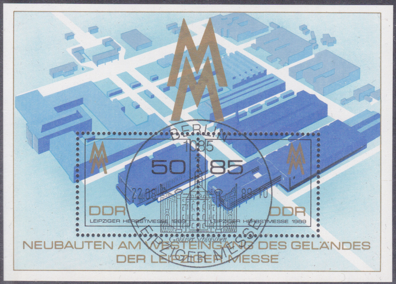 Heute zeige ich den schon von Matthias hier vorgestellten Block zur Herbstmesse 1989, jetzt aber mit dem Ersttagsonderstempel Berlin.