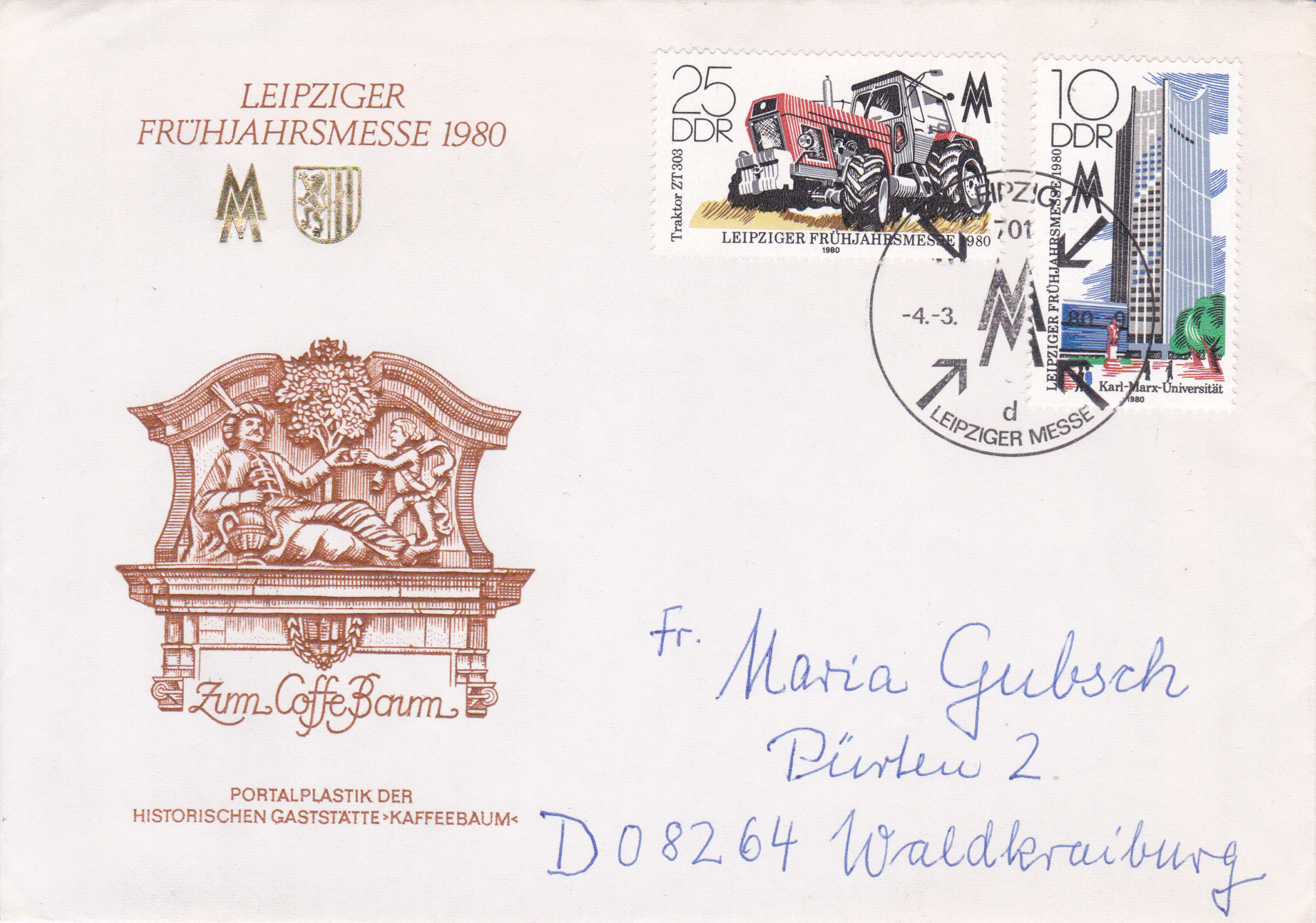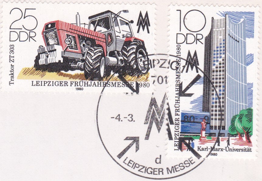 Heute zeige ich einen echt gelaufenen Brief vom Ersttag mit den zwei Marken zur Frühjahrsmesse 1980 (MiNr 2498/2499) mit dem Sonderstempel aus Leipzig vom 4.3.1980.