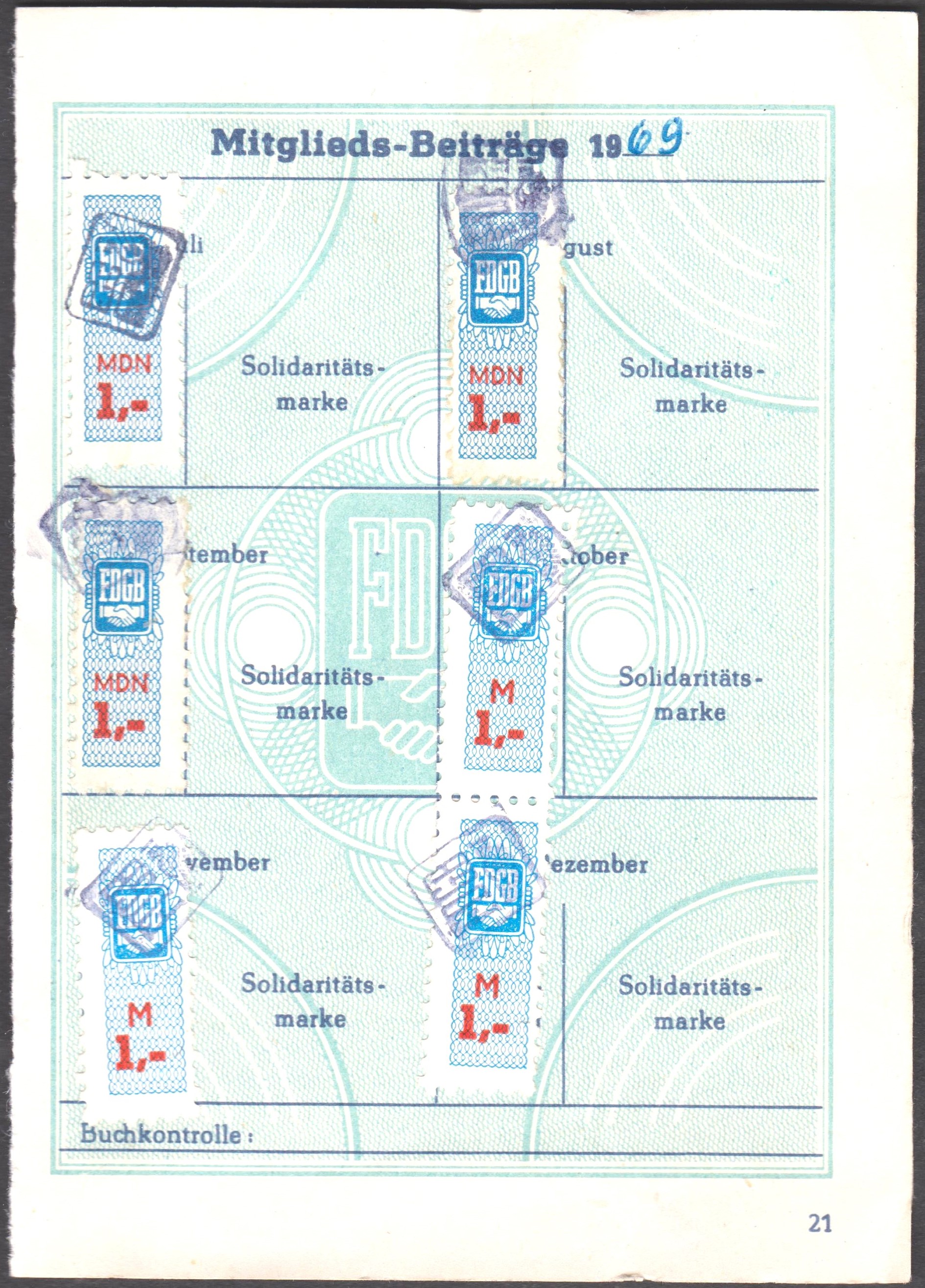 Für die Monate Januar bis Juli 1969 wurden FDGB Beitragsmarken der Wertstufen -,50 M bzw. 1,- MDN verklebt und per FDGB-Stempel "entwertet"!