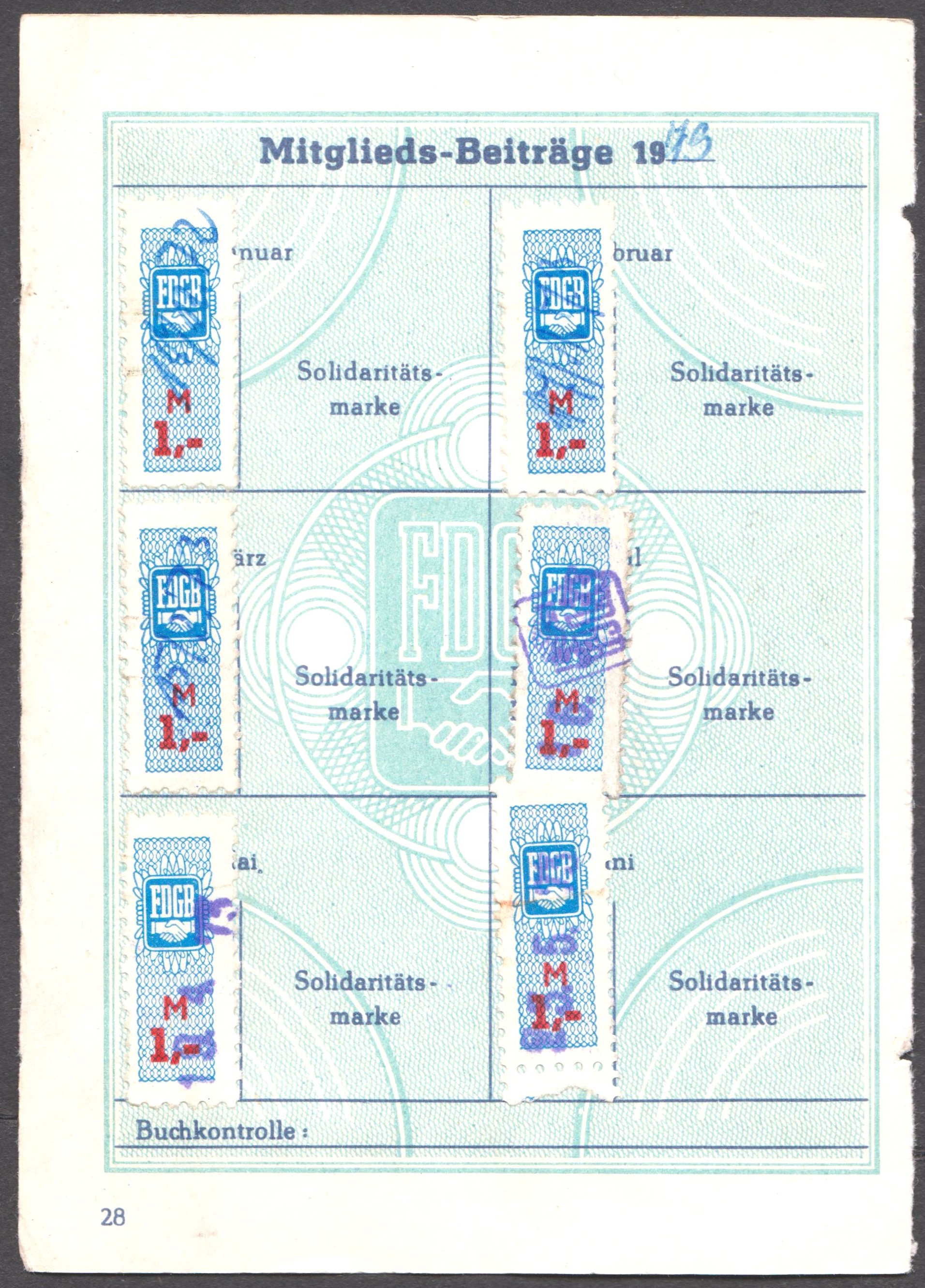 Auf der Rückseite die "Seite 28" aus diesem MITGLIEDSBUCH Freier Deutscher Gewerbschaftsbund für "Mitglieds-Beiträge 1973":