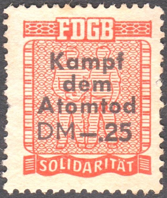 Solche Spendenmarken 1955/5 des FDGB "Kampf dem Atomtod" gab es in den drei Wertstufen DM -.25, DM, 1.- DM sowie DM 5.-: