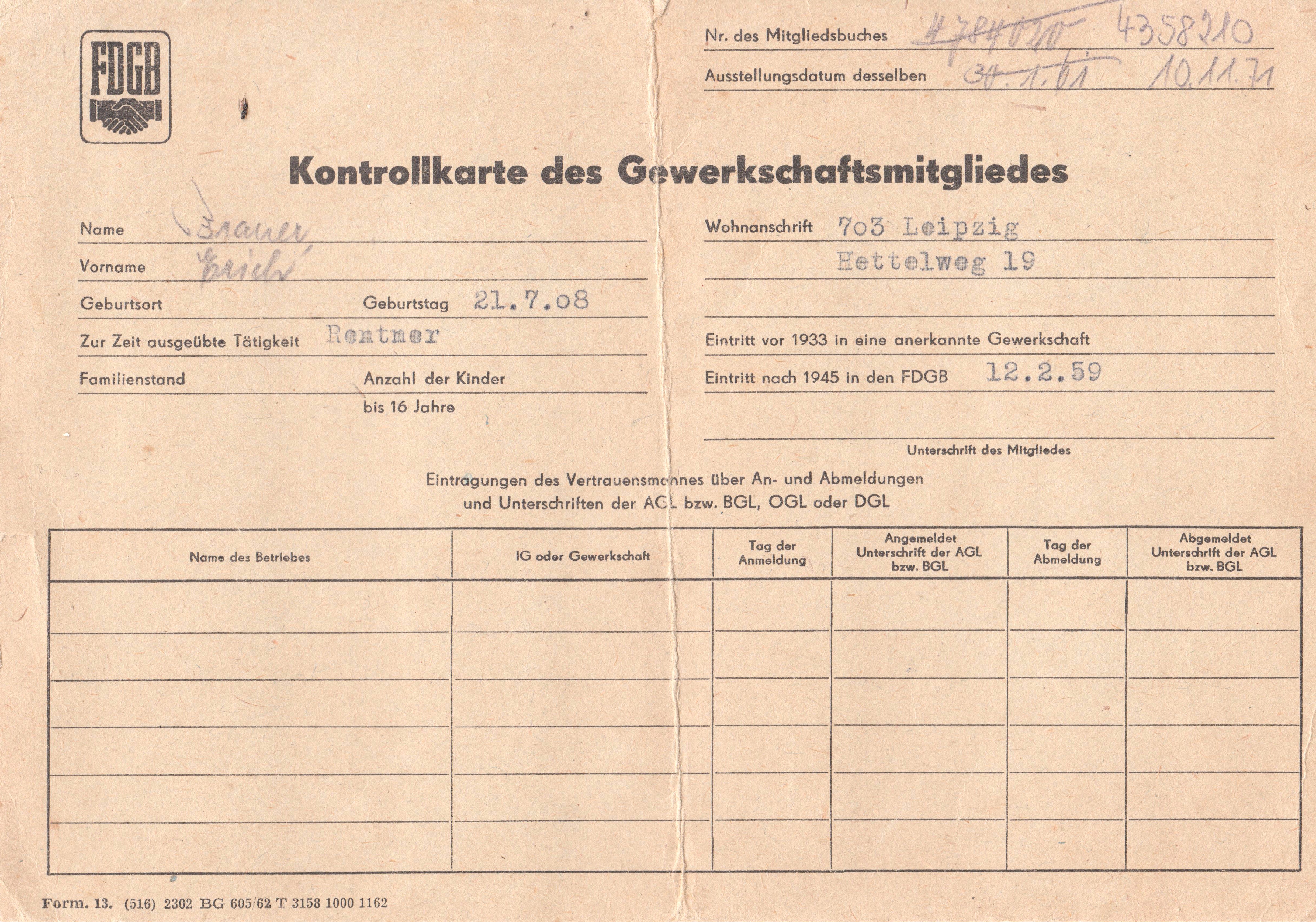 Formular "FDGB Kontrollkarte des Gewerkschaftsmitgliedes" für einen "Rentner":