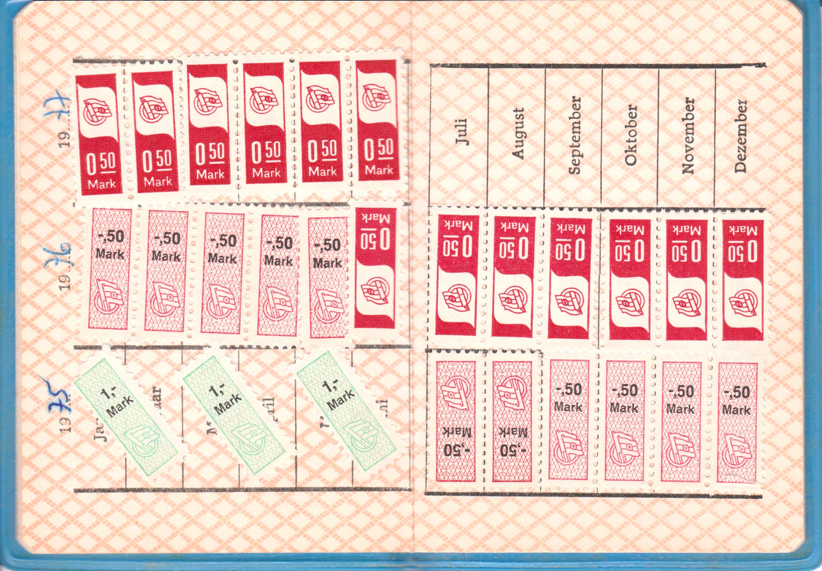 1975 waren noch keine Gebührenmarken der Wertstufe -.50 Mark verfügbar und es wurde für je zwei Monate eine Gebührenmarke der Wertstufe 1,- Mark verklebt: