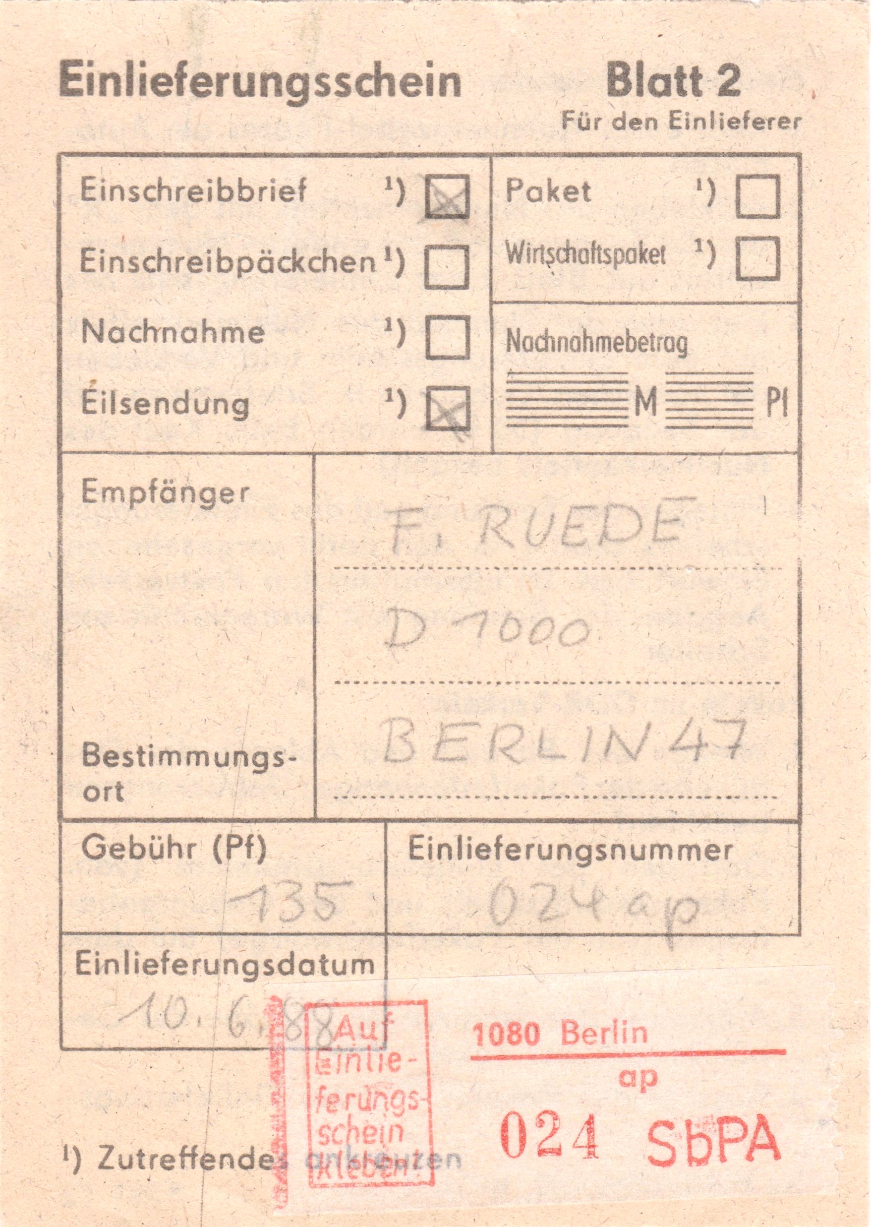 Einlieferungsschein für eine SbPA-Sendung vom 10.06.1988 aus 1080 Berlin mit Einlieferungsnummer "024 ap":
