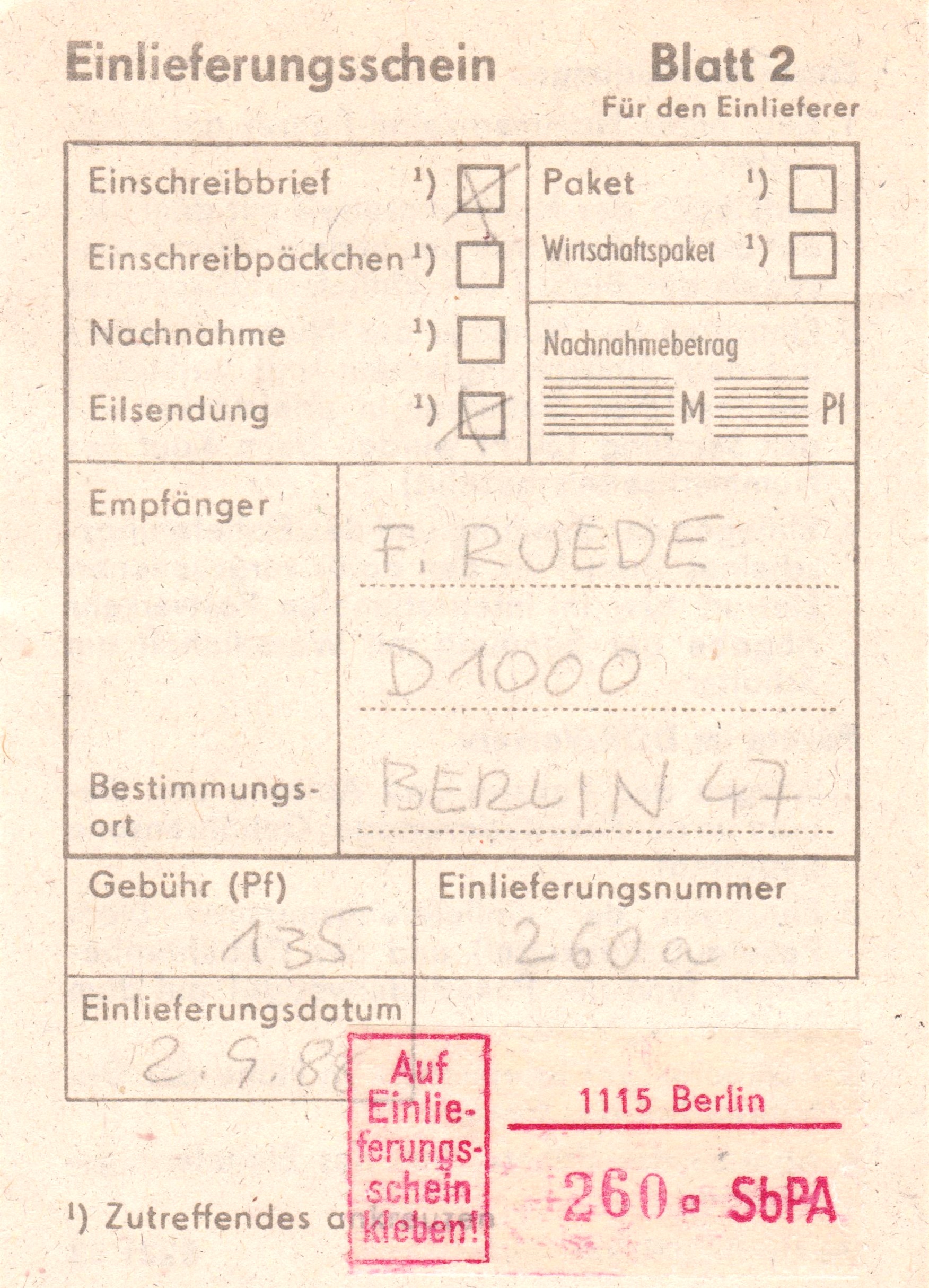 Einlieferungsschein für eine SbPA-Sendung vom 02.09.1988 aus 1115 Berlin mit Einlieferungsnummer "260 a":
