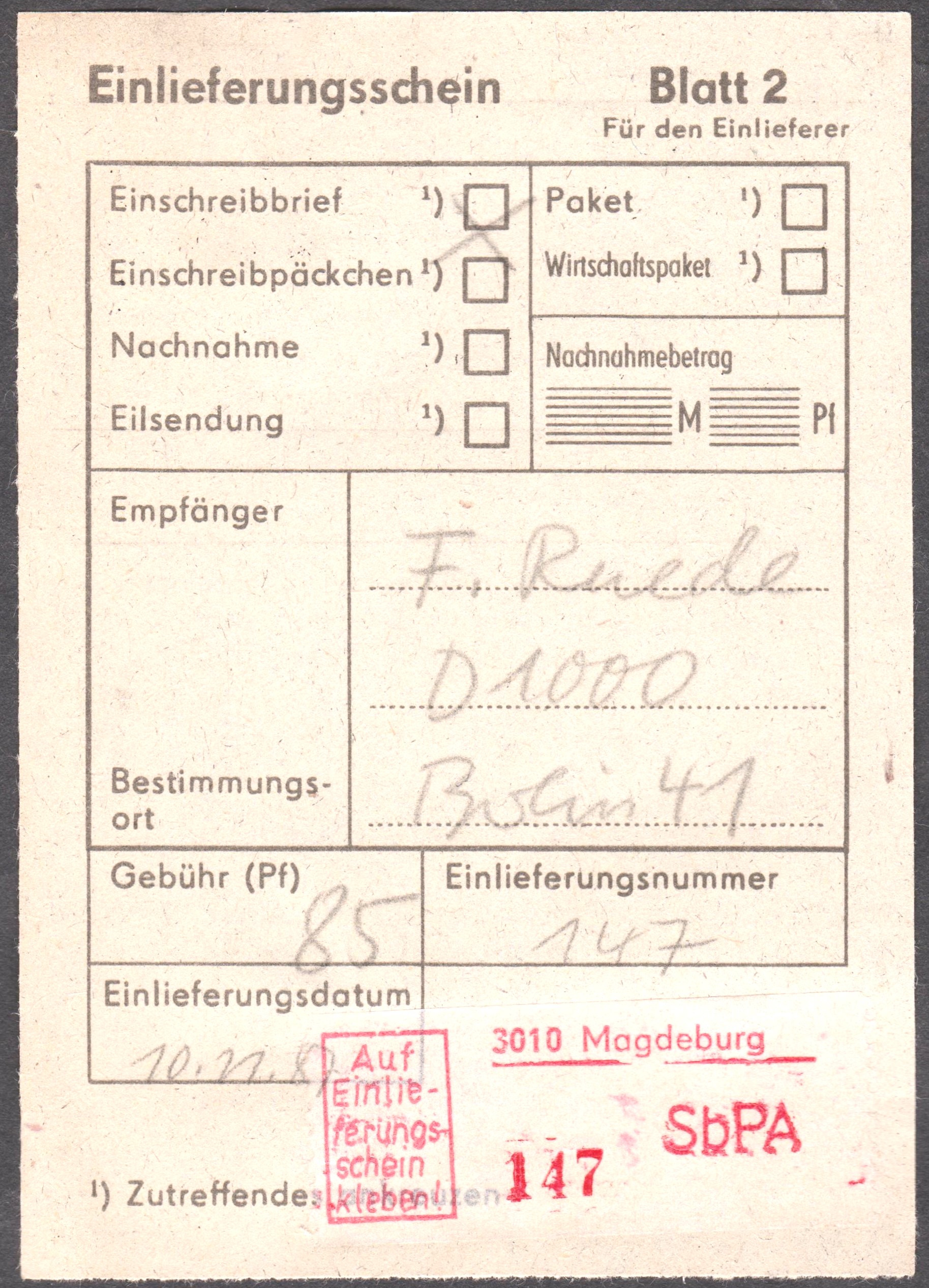 Einlieferungsschein für eine SbPA-Sendung vom 10.11.1987 aus 3010 Magdeburg mit Einlieferungsnummer "147":