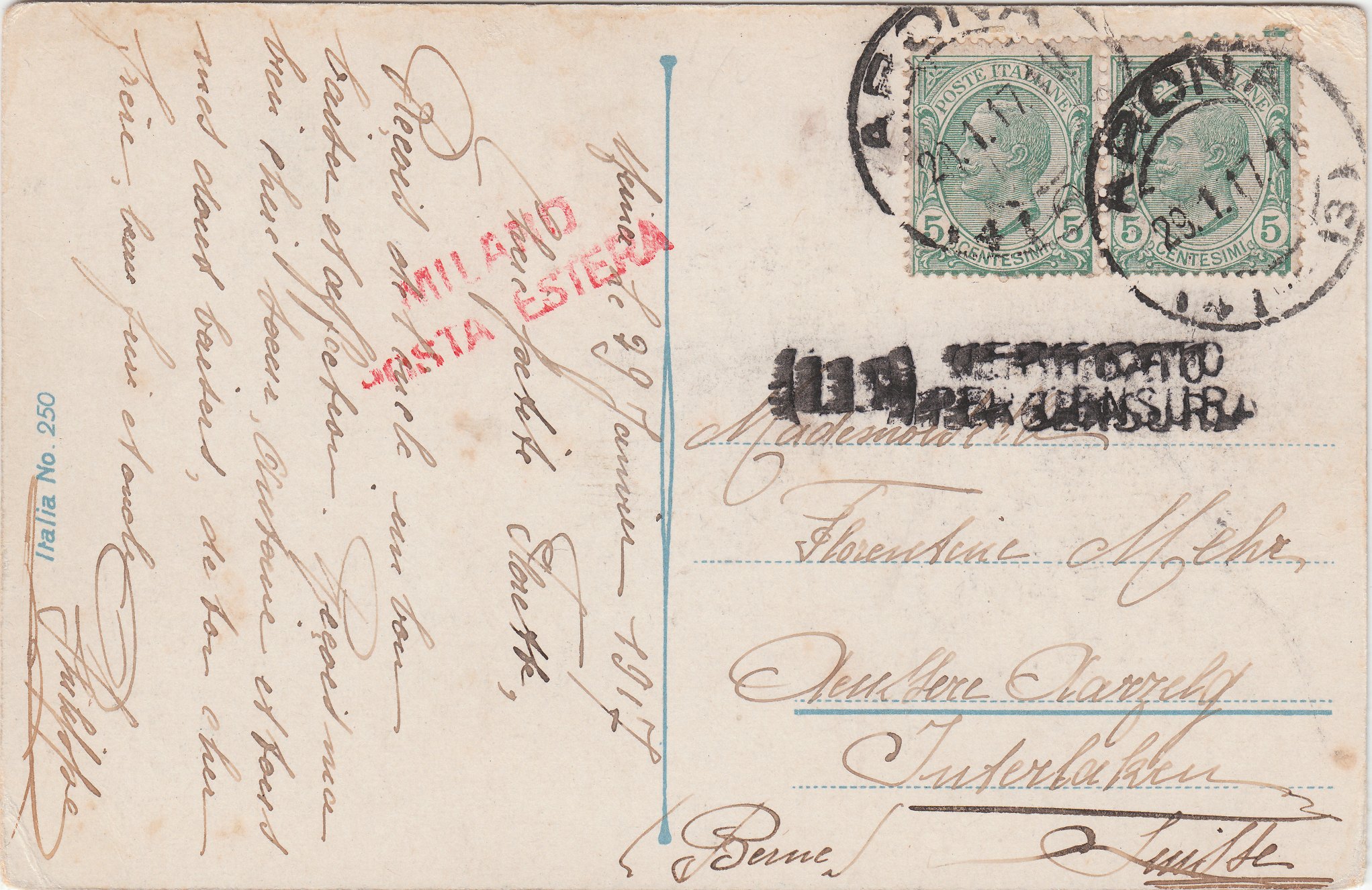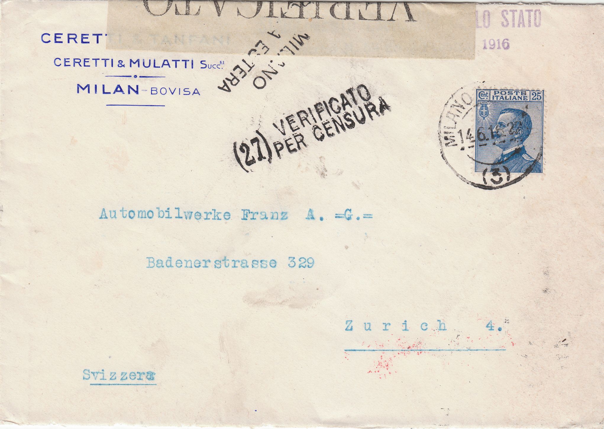 Bei Auslandspost wie diesem Brief in die Schweiz wurde ein Zweizeiler der Zensurstelle in Rot "MILANO POSTA ESTERA" abgeschlagen.