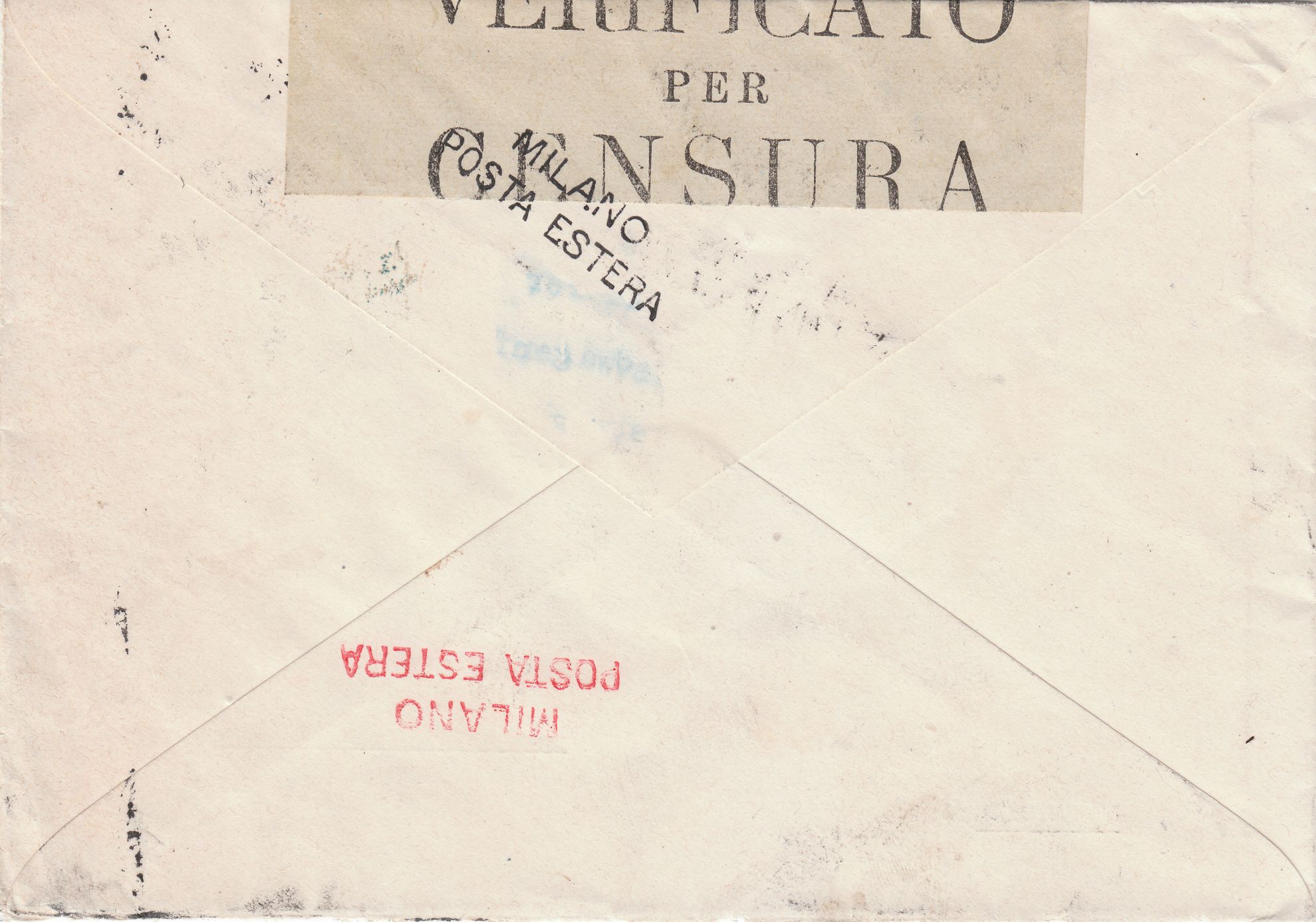Der Beleg wurde in der Zensurstelle in Mailand oben geöffnet und nach erfolgter Prüfung mit einem Verschlußzettel "VERIFICATO PER CENSURA" wieder verschlossen. Diese Zensurmaßnahme wurde vorderseitig sowie rückseitig per Zweizeiler "MILANO POSTA ESTERA" dokumentiert.