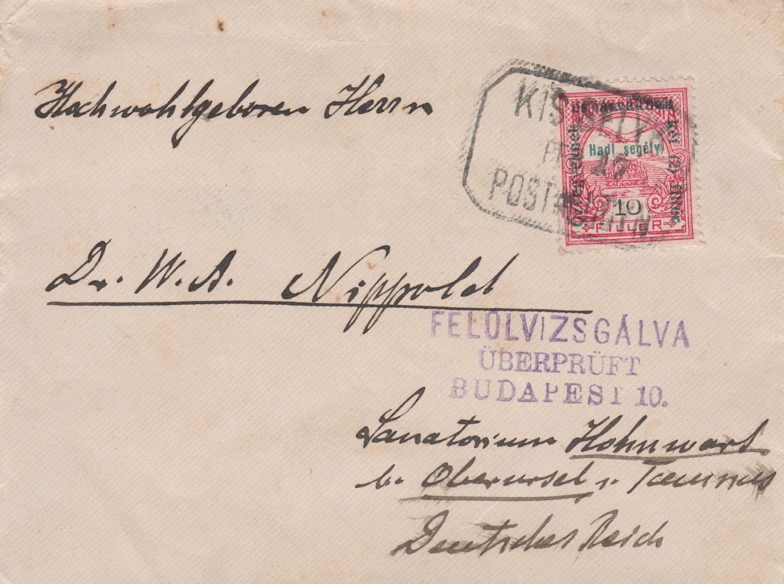 Die Zivilpost ins Ausland wurde während des Ersten Weltkrieges in Ungarn zensuriert. Zur Dokumentation wurde bei diesem in Igló aufgegebenen Brief nach Kopenhagen ein dreizeiliger Stempel "FELÜLVIZGALVA ZENSURIERT BUDAPEST" in Violett verwendet. Die "72/8" in diesem Stempel dürfte die Prüfernummer sein: