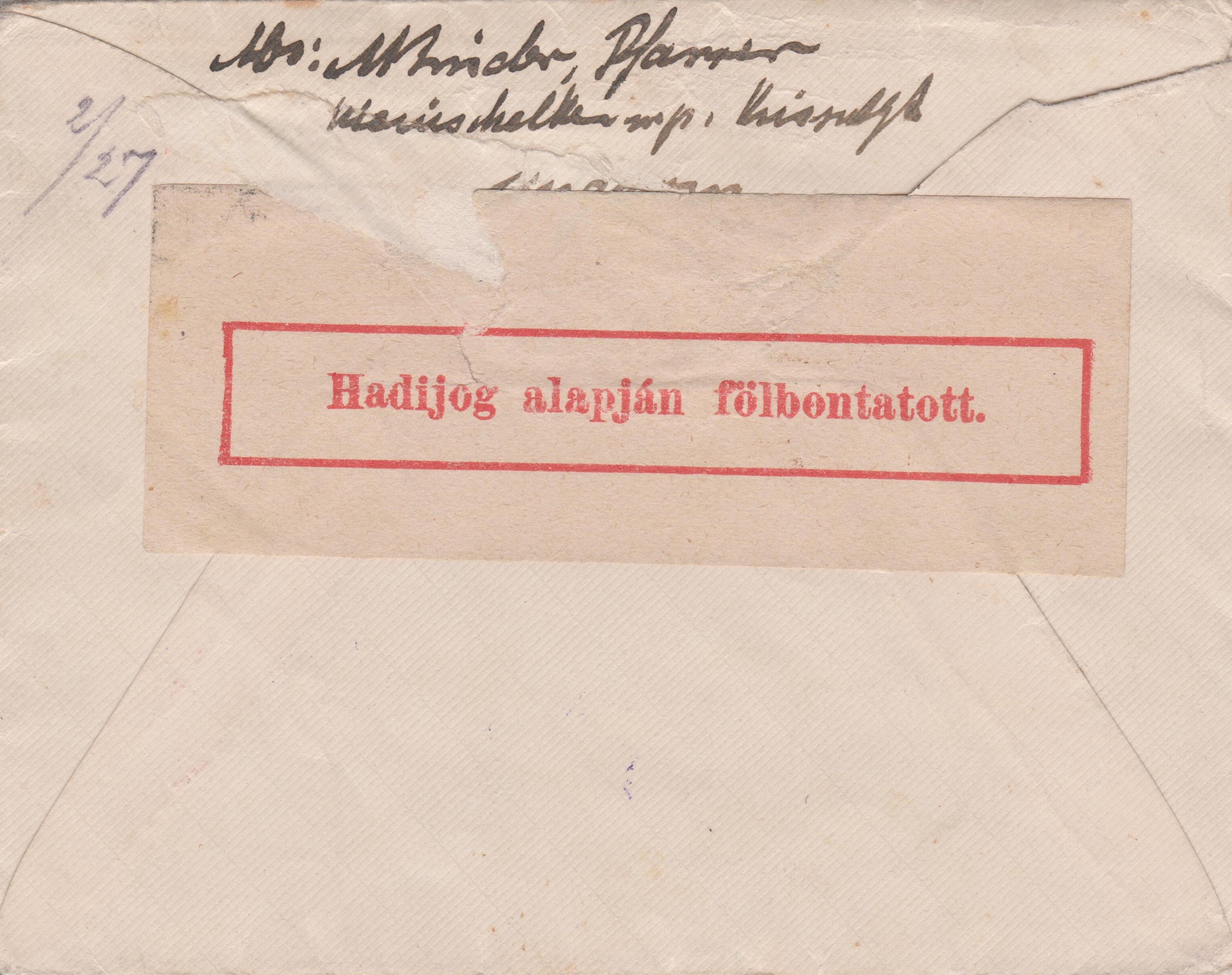 Rückseitig wurde, leider direkt über der Frankatur, ein Verschlußzettel im für Ungarn üblichen länglichen Querformat, hier 91 x 40 mm angebracht, der in einem Rahmen die Inschrift "Hadijog alapján fölbontatott." in roter Druckfarbe trägt: