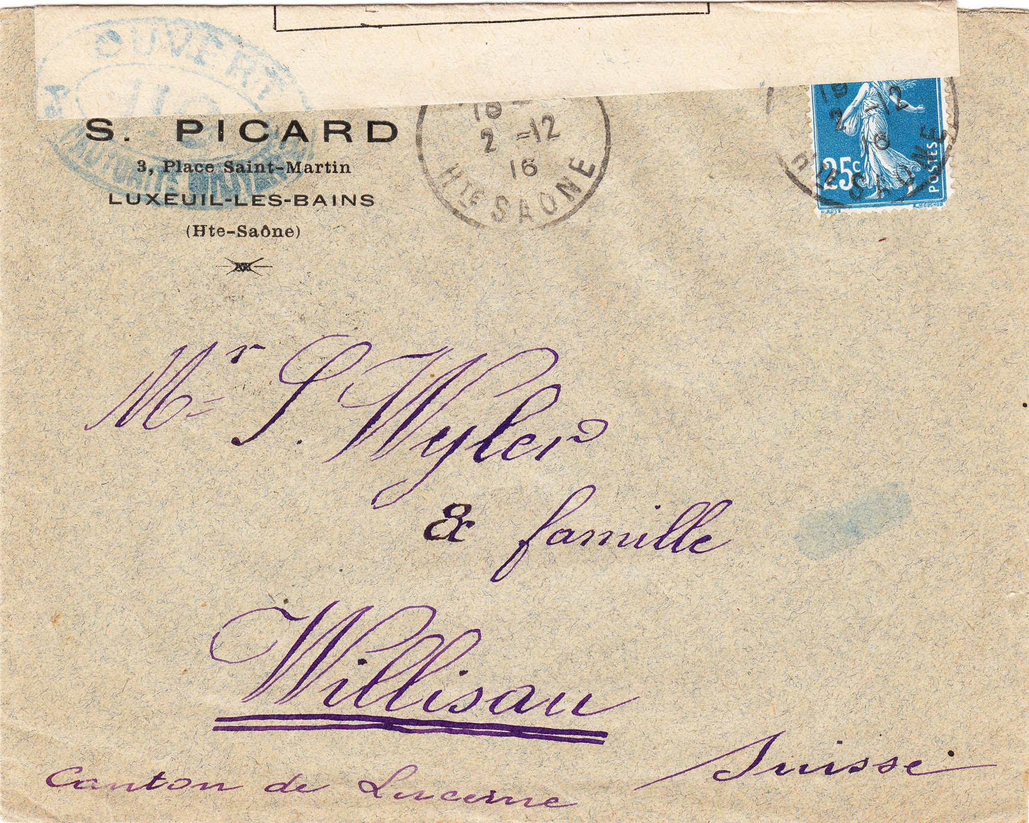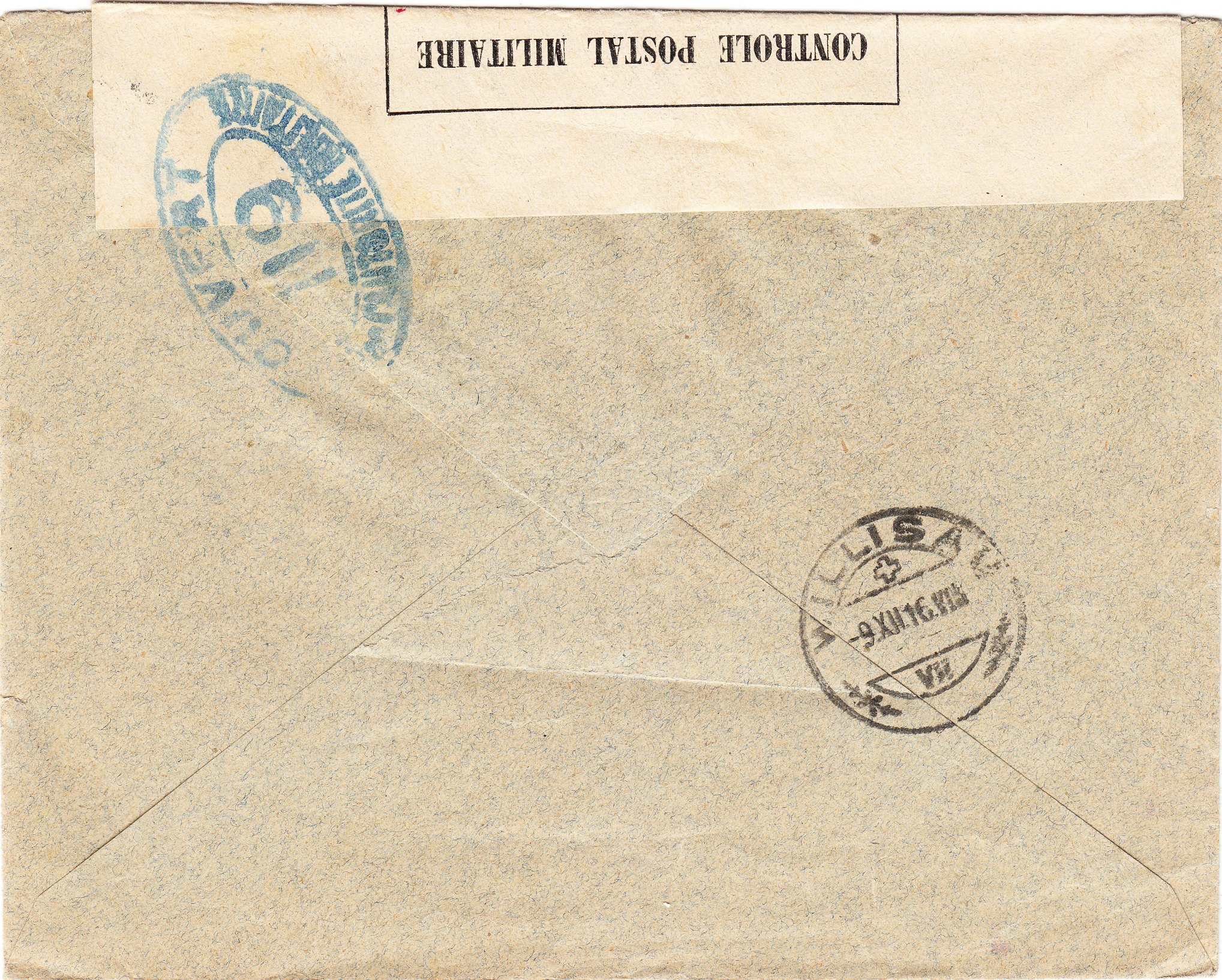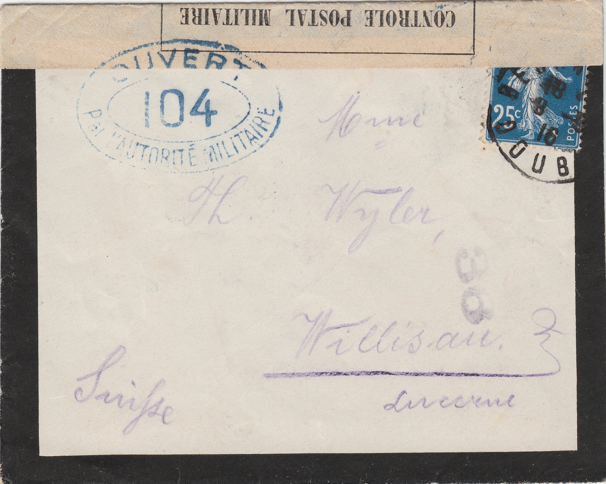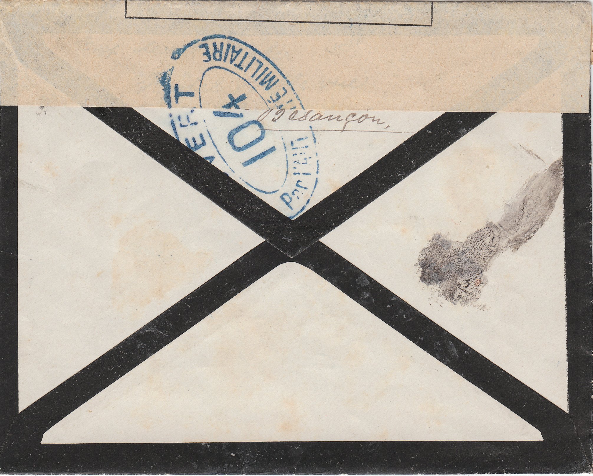 In Besançon wurde dieser Doppelovalstempel mit dem Nummernkreis 101 bis 150 eingesetzt, hier ein Beispiel mit dem Stempel mit der Nummer 104, der vorderseitig sowie rückseitig auf dem Zensur-Verschlußzettel "CONTROLE POSTAL MILITAIRE" in Schwarz im Rahmen von 61 x 14 mm auf weißem Papier abgeschlagen wurde: