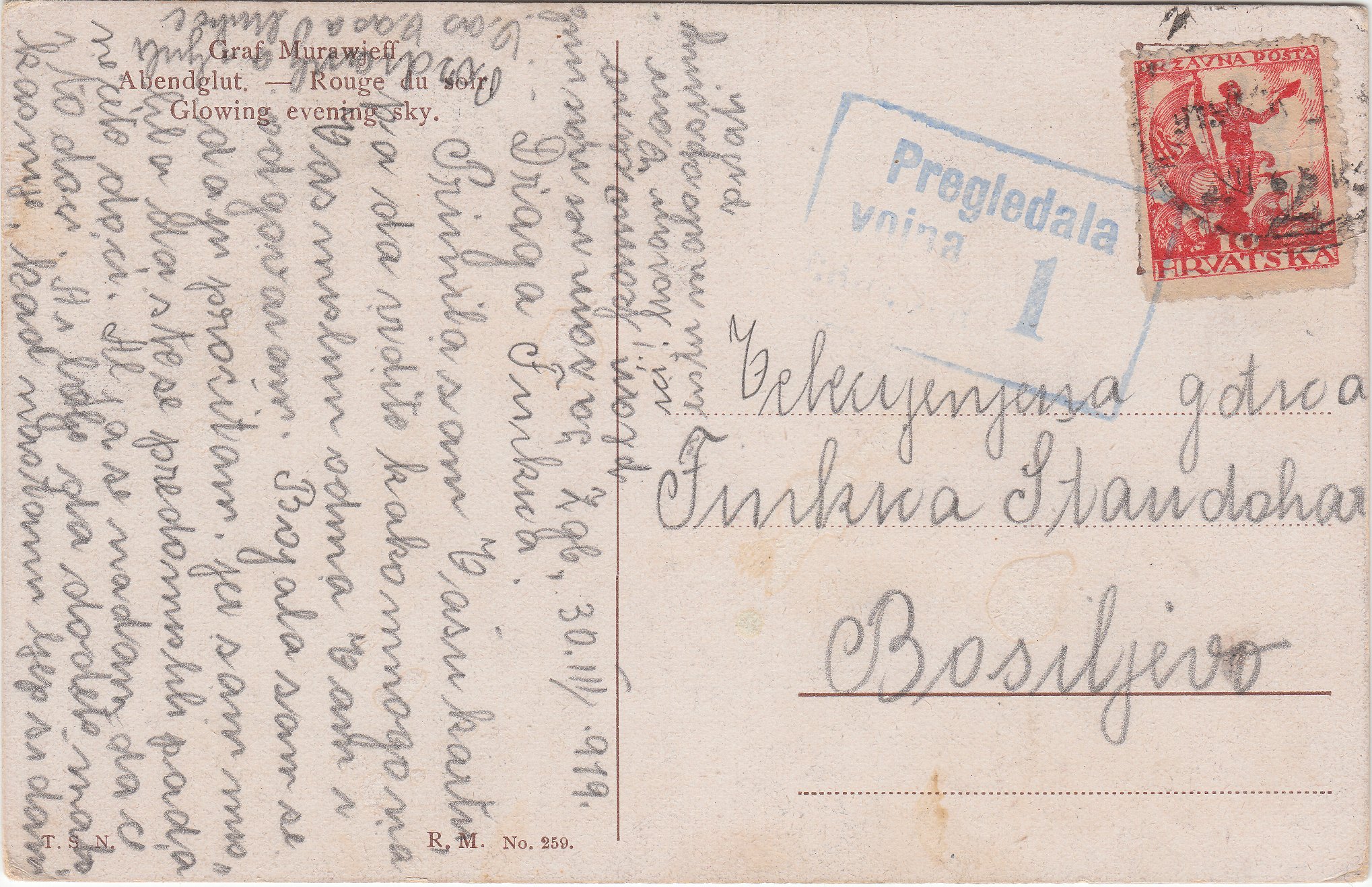 Hier eine nach Bosiljevo in Kroatien adressierte Postkarte, die am 30.03.1919 in Zagreb in Kroatien aufgegeben wurde und bei der jugoslawischen Zensur vorderseitig den Abschlag eines dreizeiligen Rahmenstempel "Pregledala vojna cenzura" mit der Nummer "1" in Blau erhielt: