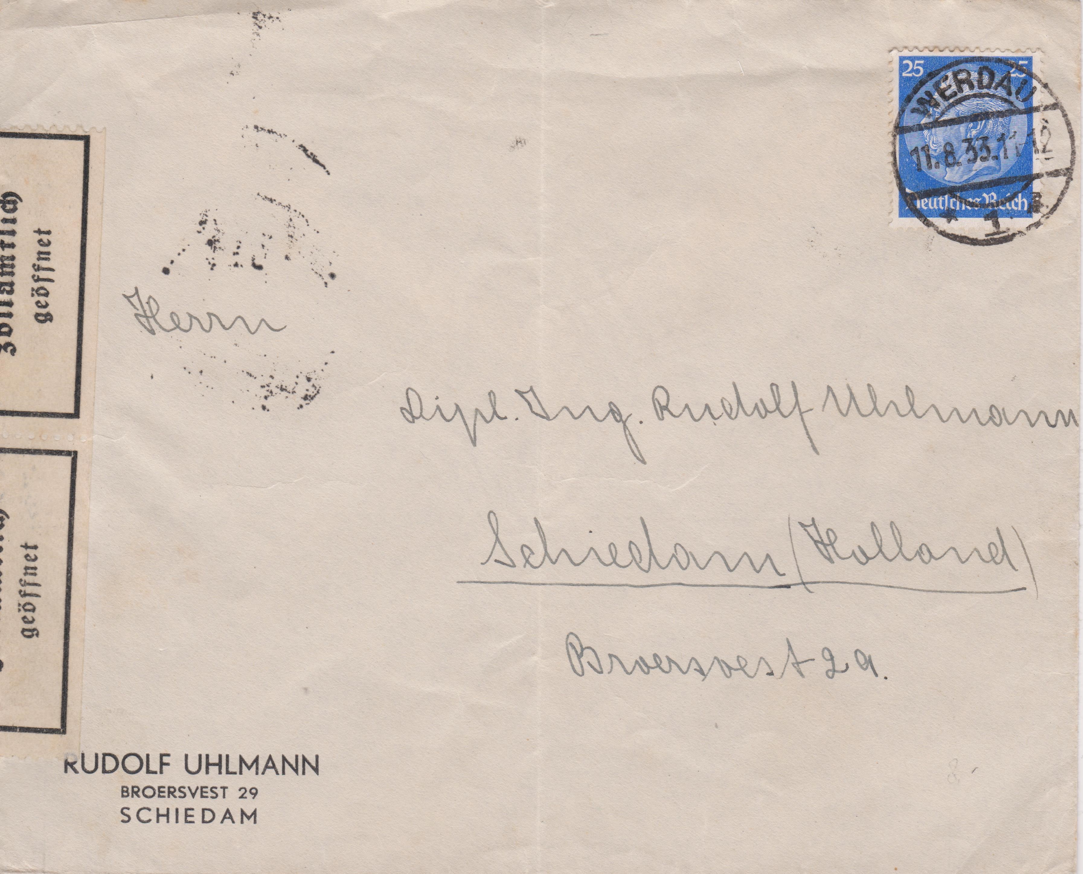 Dieser nach "Schiedam (Holland)" adressierte Brief wurde am 11.08.1933 portogerecht per Einzelfrankatur mit einem 25 Pf-Wert der Dauerserie Hindenburg frankiert in WERDAU aufgegeben: