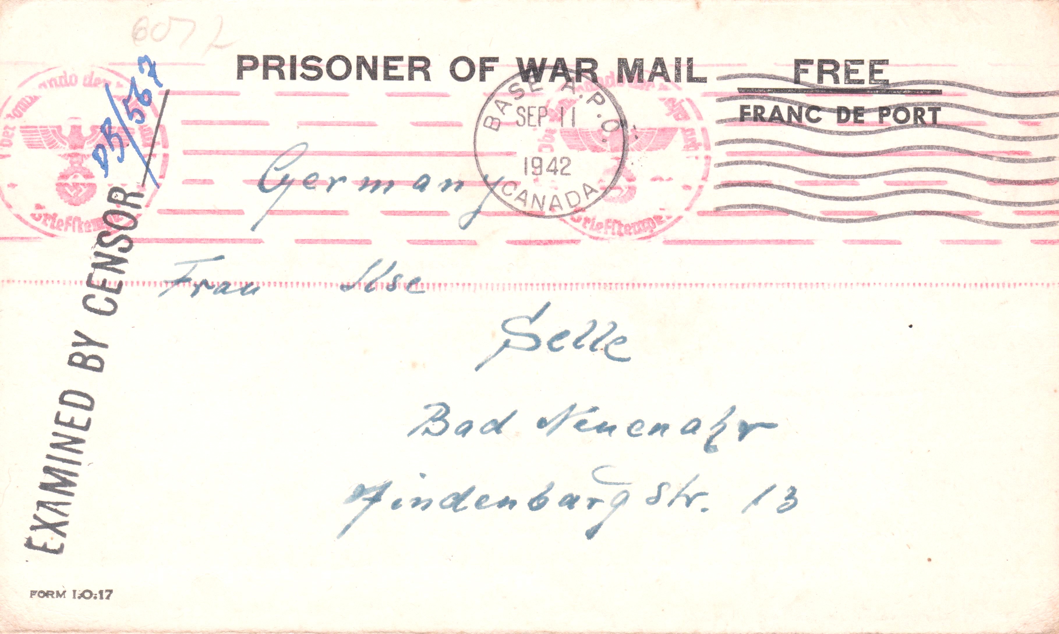 Postkarte, geschrieben am 30.01.1943 im Internment Camp "100", Aufgabestempel "BASE A. P. O. CANADA" vom 08.02.1943, adressiert nach "Bad-Neuenahr".