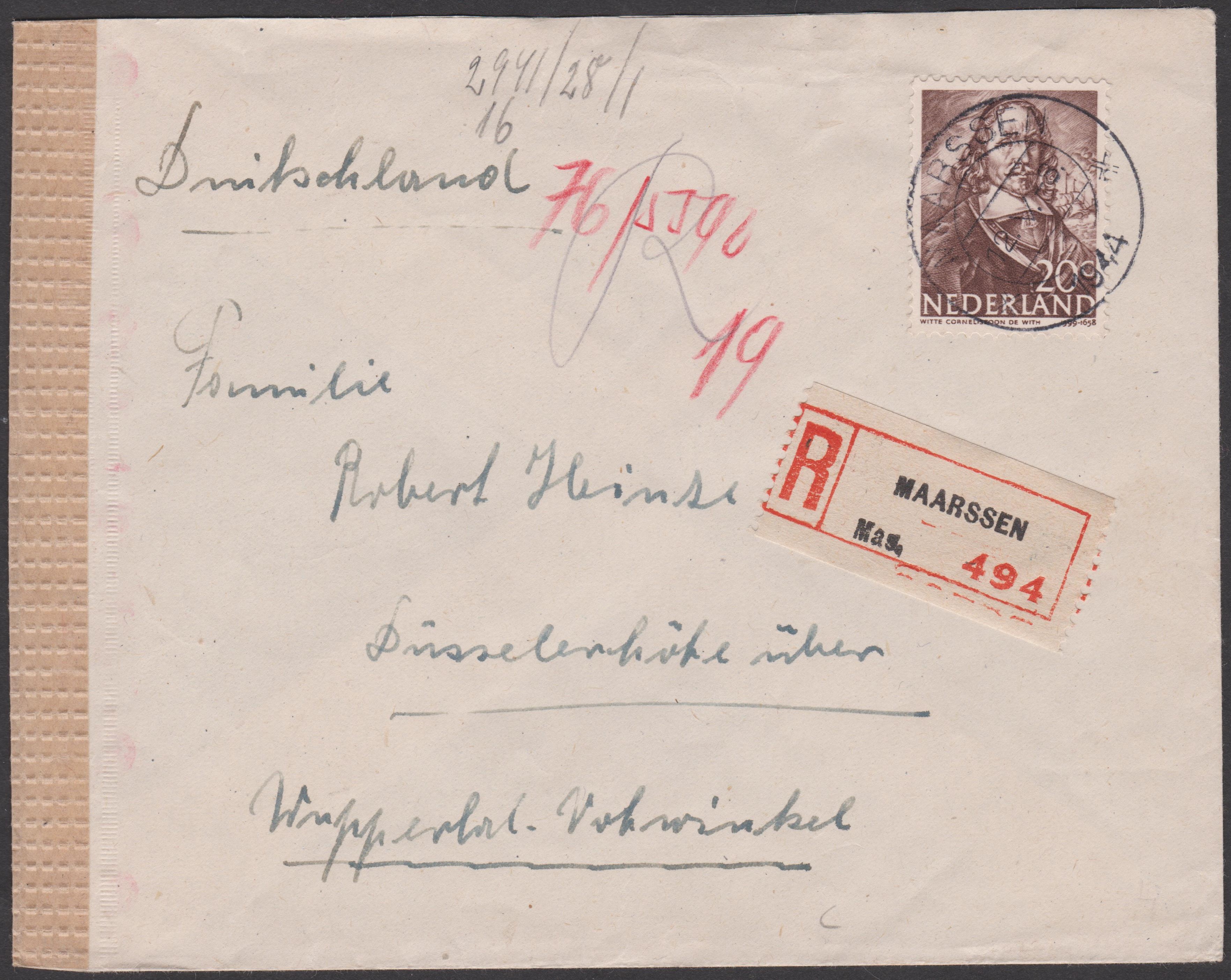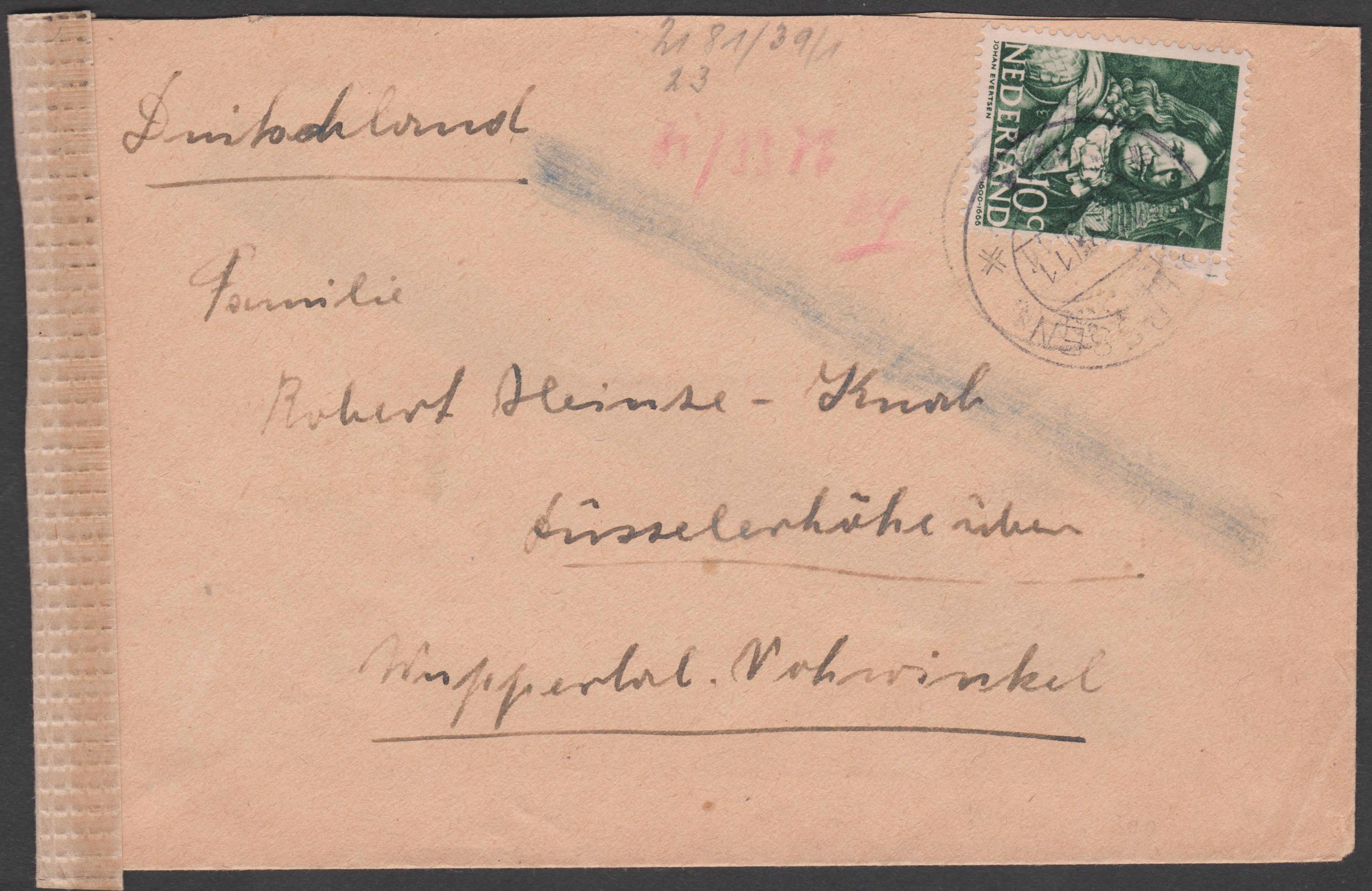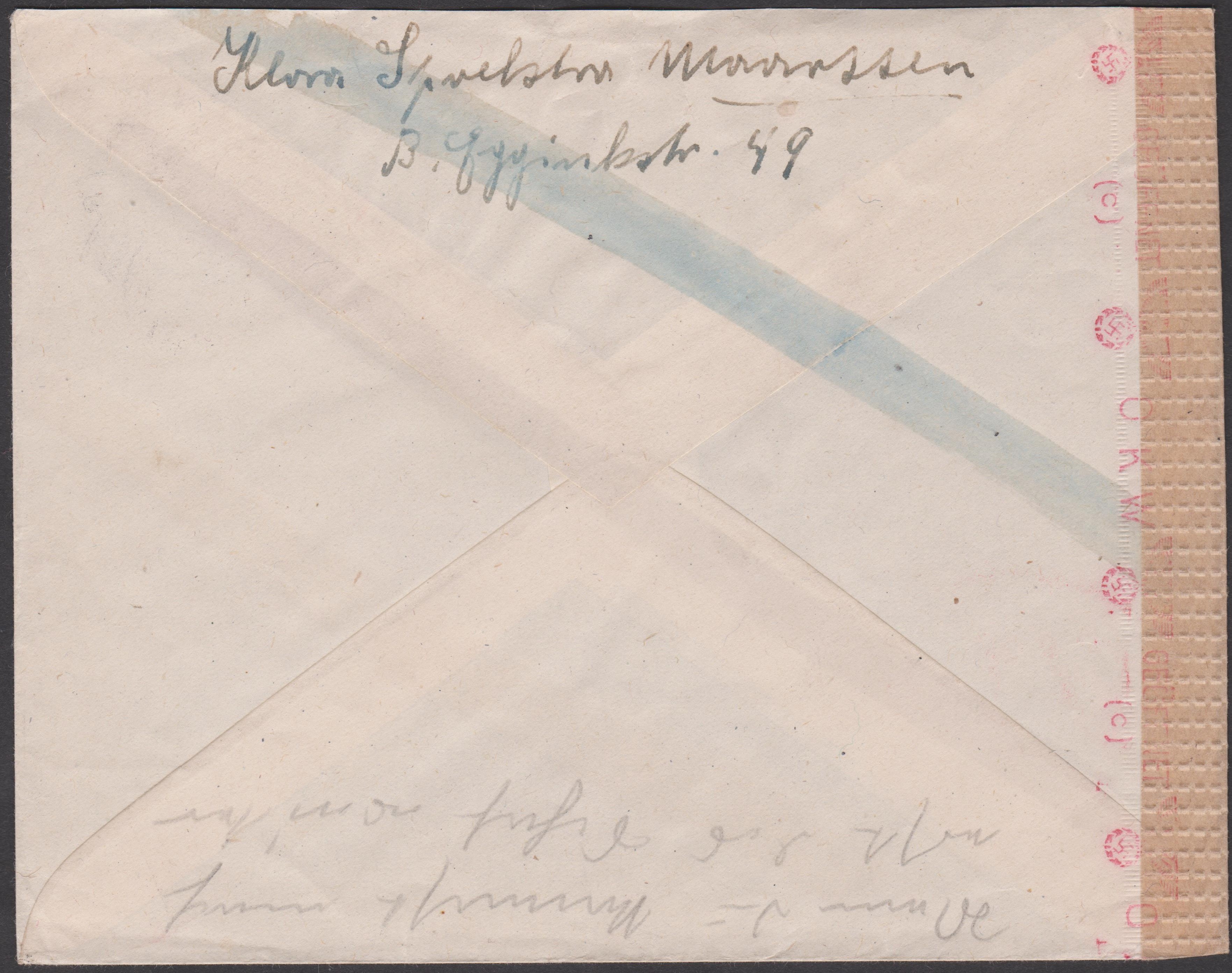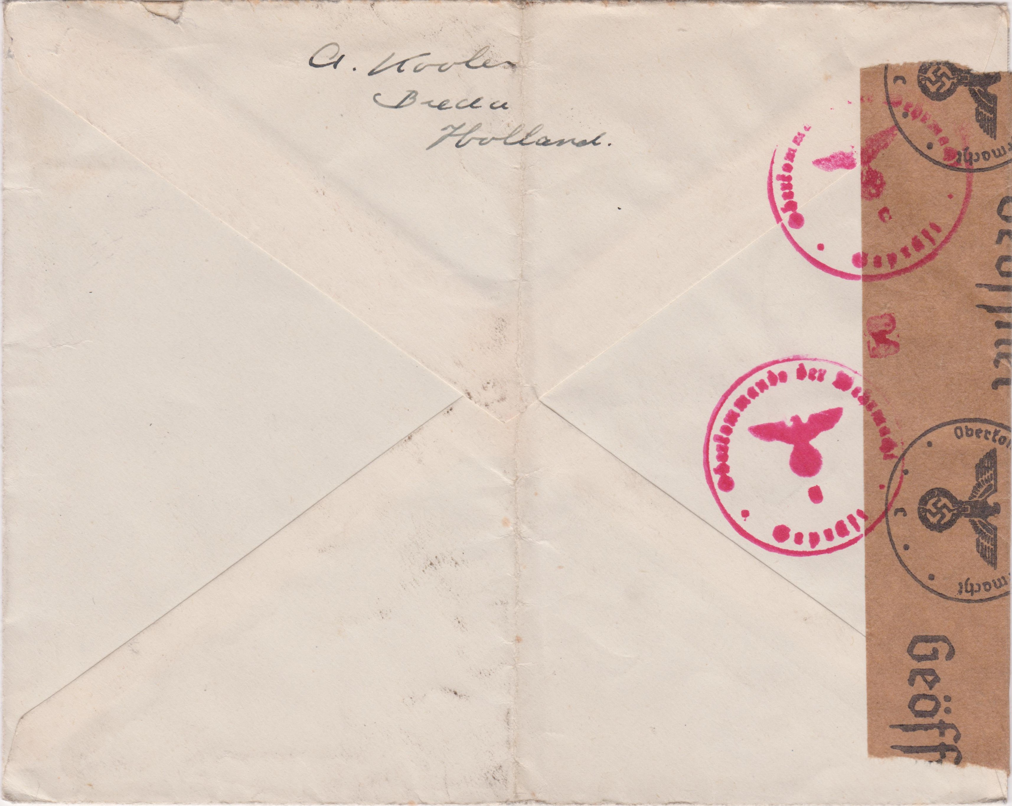 Der Brief wurde der für Post aus den Niederlanden zuständigen Auslandsbriefprüfstelle Köln zugeleitet, wo er linksseitig geöffnet und nach erfolgter Prüfung mit einem Verschlußstreifen wieder verschlossen wurde, was per Handprüfstempel in Rot dokumentiert wurde.