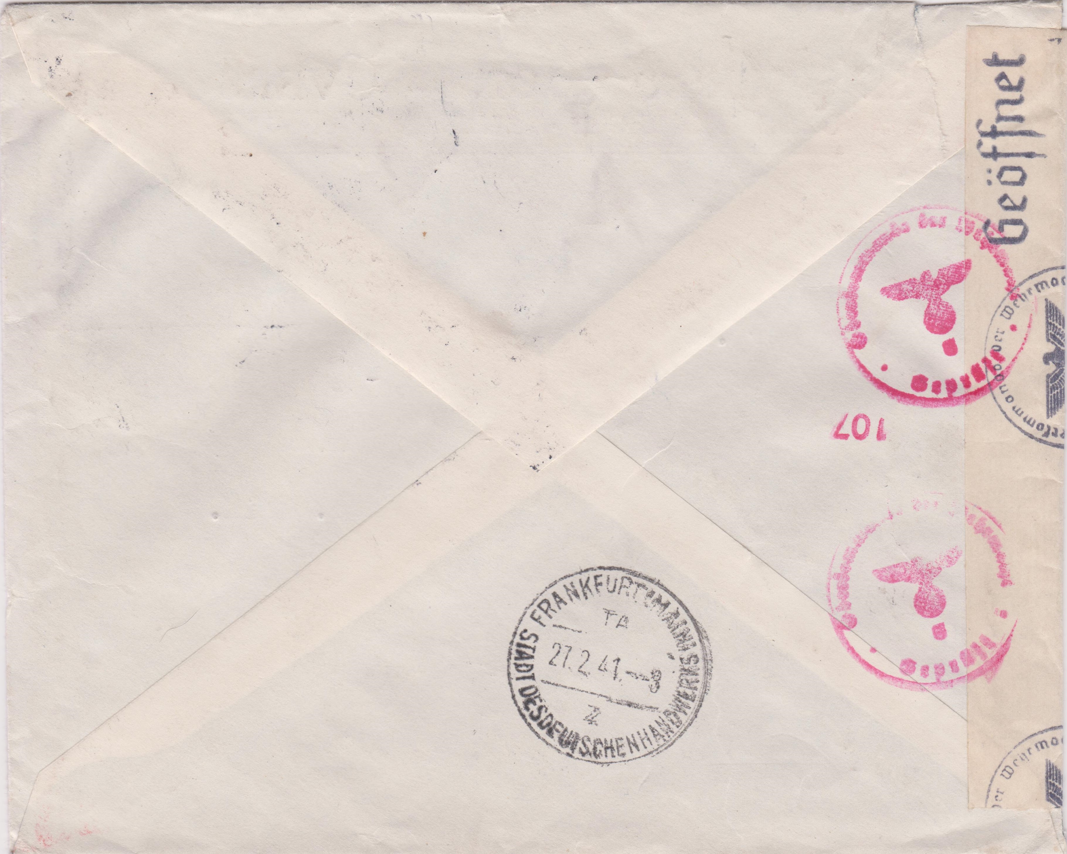 Anschließend wurde der Brief an seinen Bestimmungsort weitergeleitet, wo am 27.02.1941 rückseitig ein Tagesstempel "FRANKFURT AM MAIN STADT DES DEUTSCHEN HANDWERKS TA" als Ankunftstempel abgeschlagen wurde.