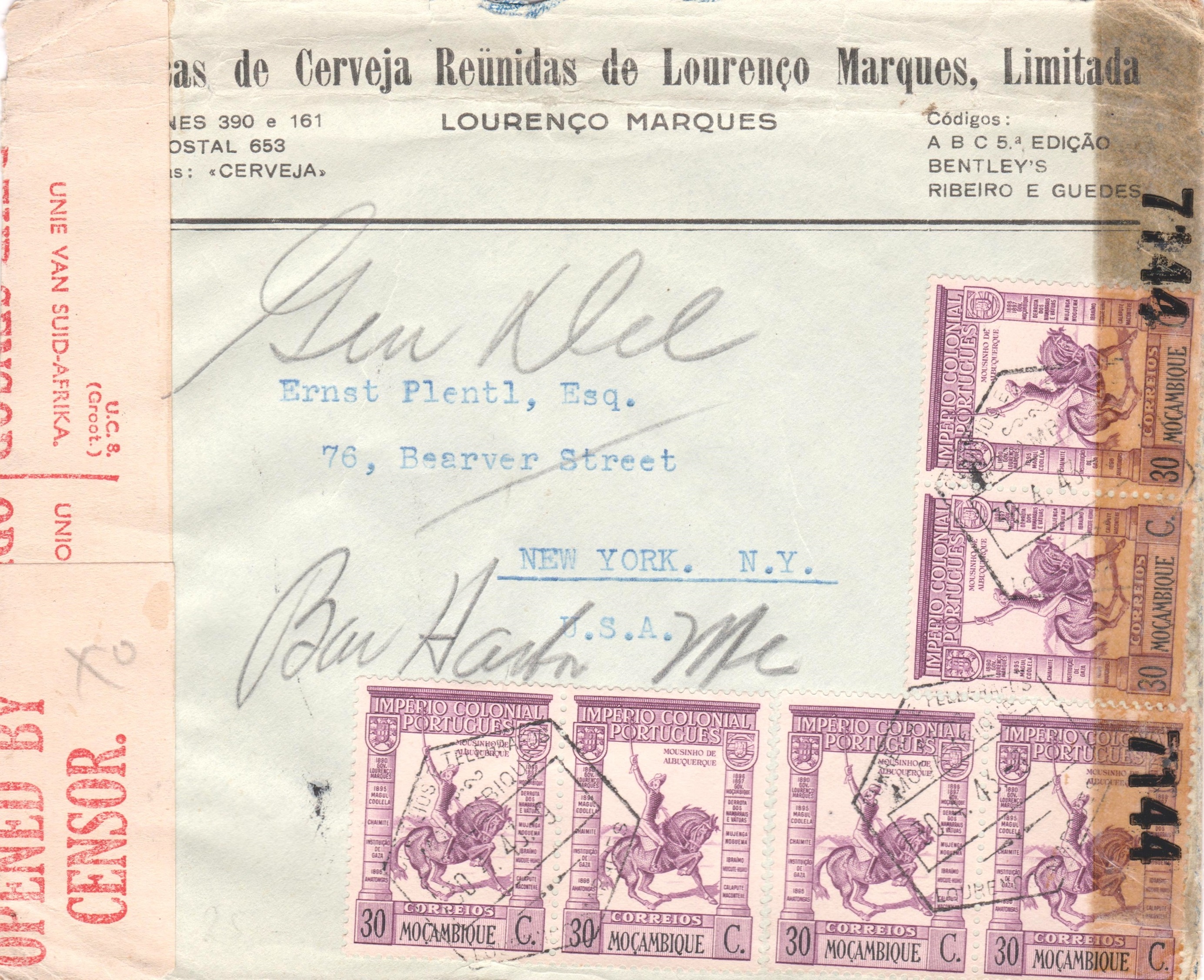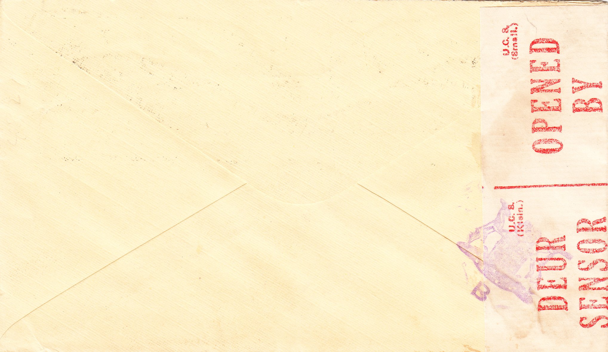 Dieser am 27.10.1942 in Johannesburg in Südafrika aufgegebene Beleg wurde linksseitig geöffnet und nach erfolgter Zensurierung mit einem zweisprachigen Verschlußzettel in Afrikaans/Englisch, "U.C. 8. (Klein.) U.C.8. (Small.) DEUR SENSOR OOPGEMAAK. OPENED BY CENSOR" wieder verschlossen: