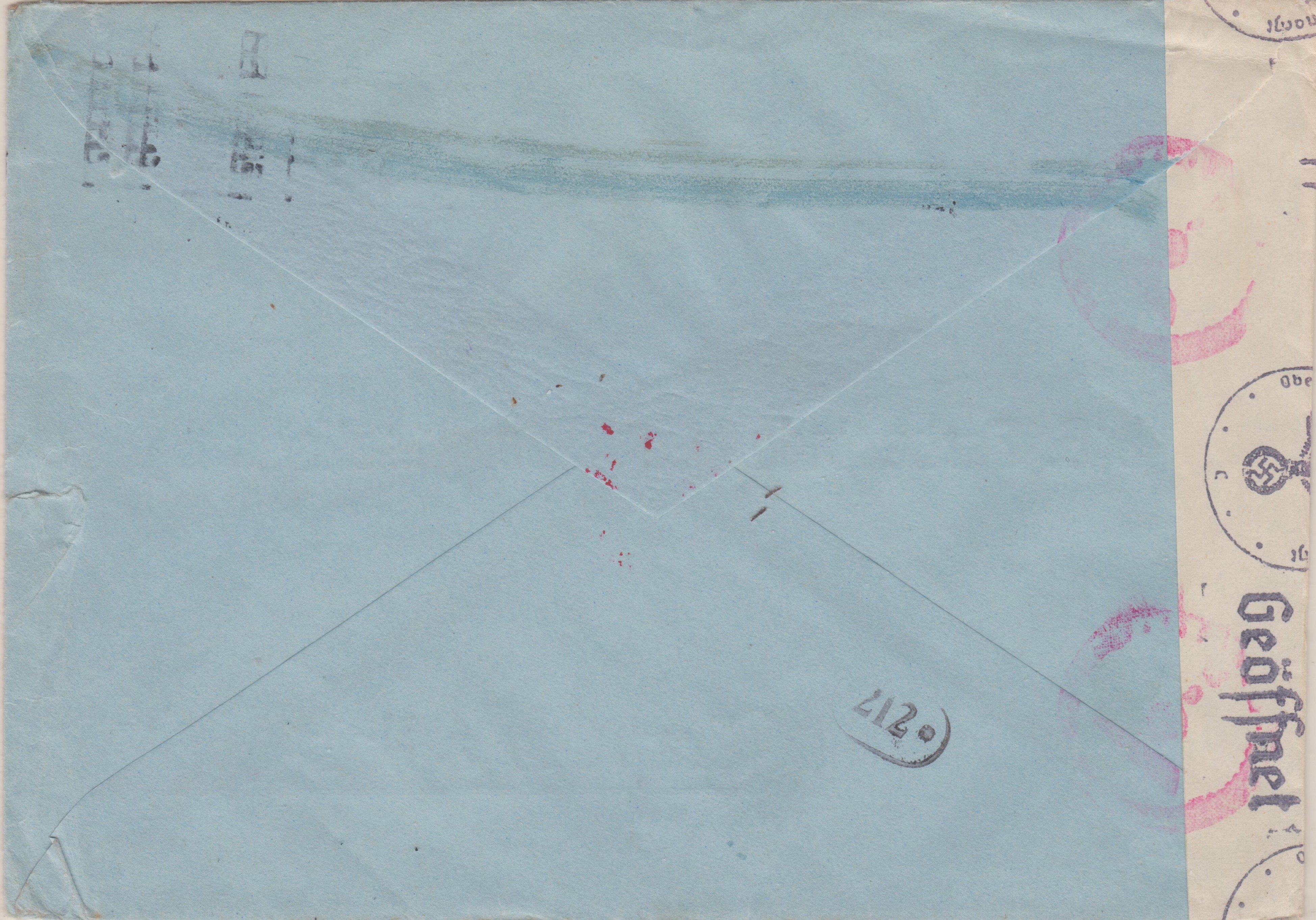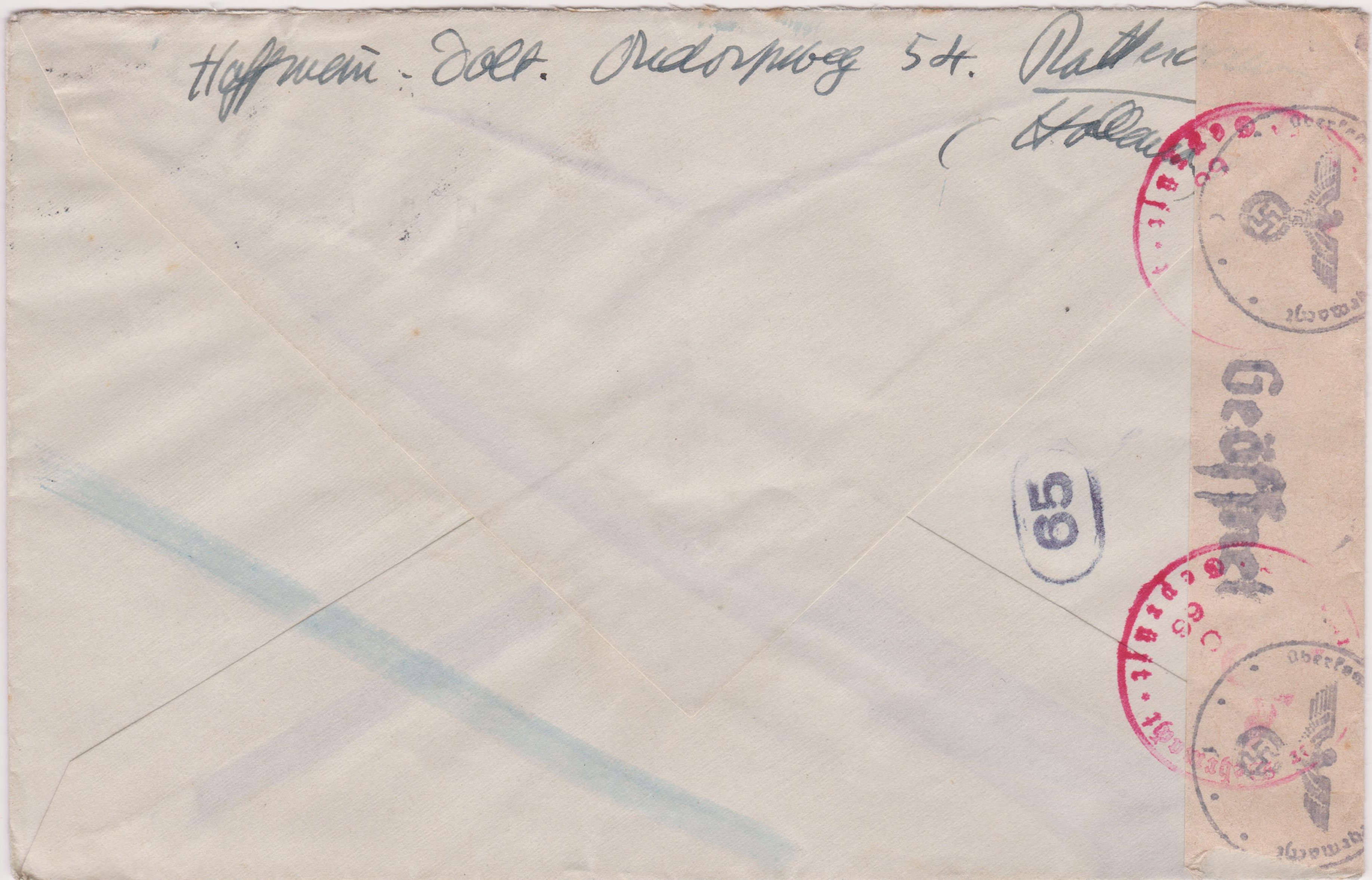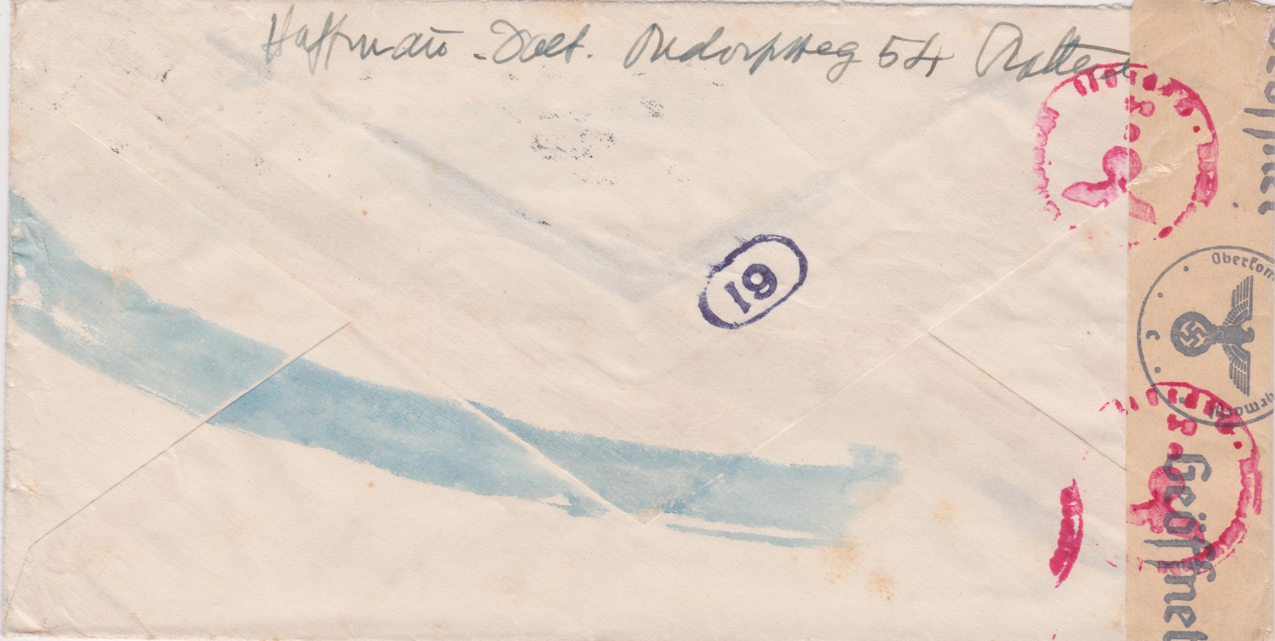 Der Brief lief durch die ABP Köln, wo er linksseitig geöffnet und nach erfolgter Prüfung mit einem Verschlußstreifen, Landsmann CV3.2, wiederverschlossen wurde, was rückseitig ein Maschinenstemelabschlag, Landsmann CPM1.1, in Rot dokumentiert.