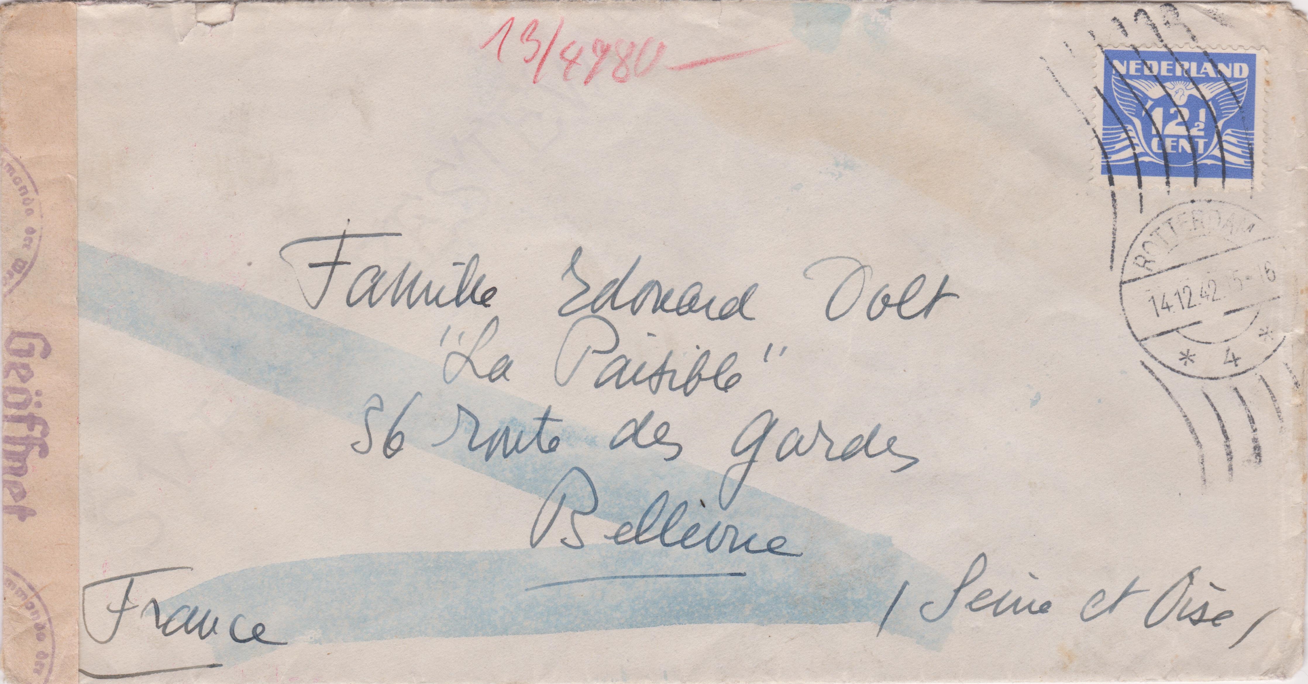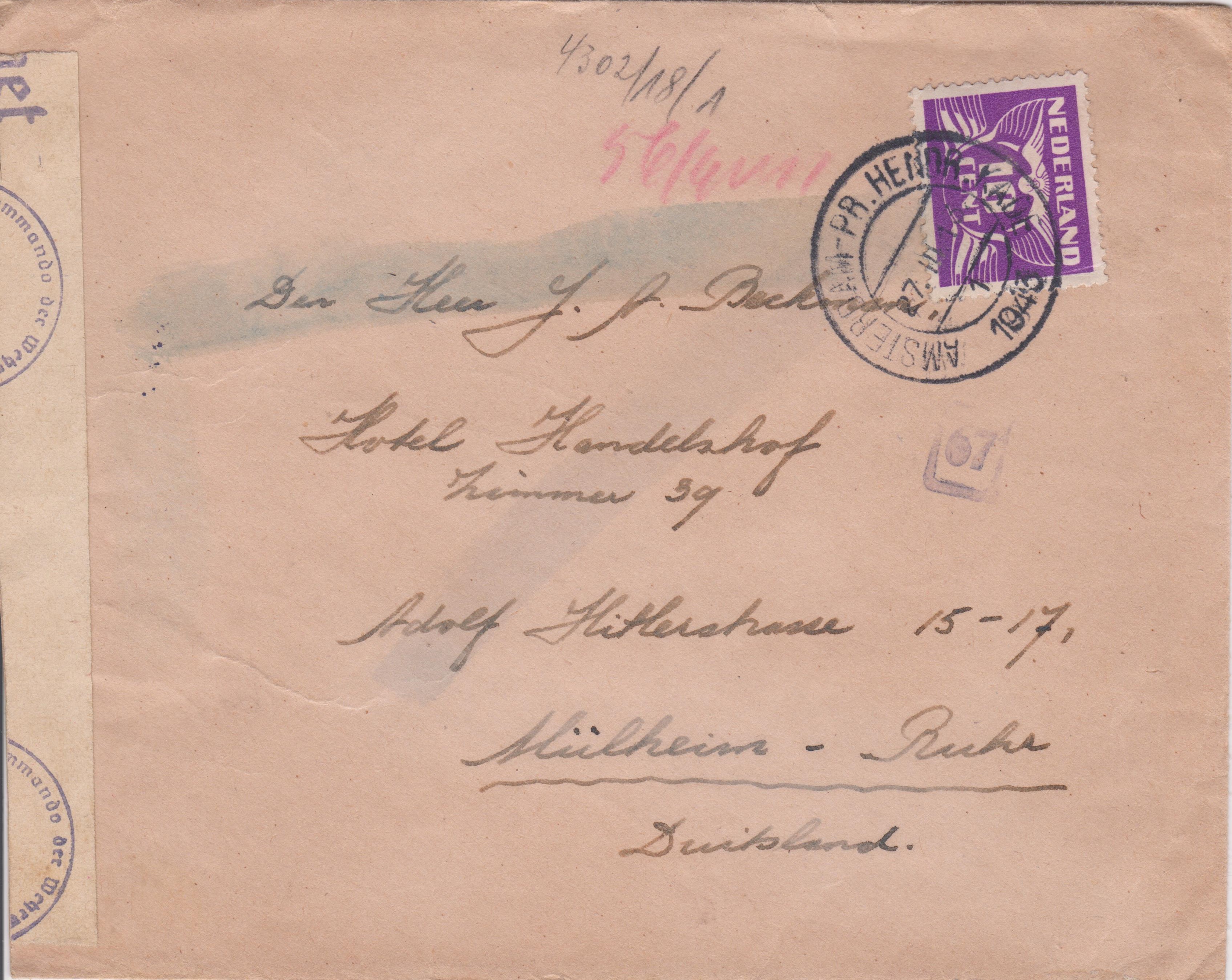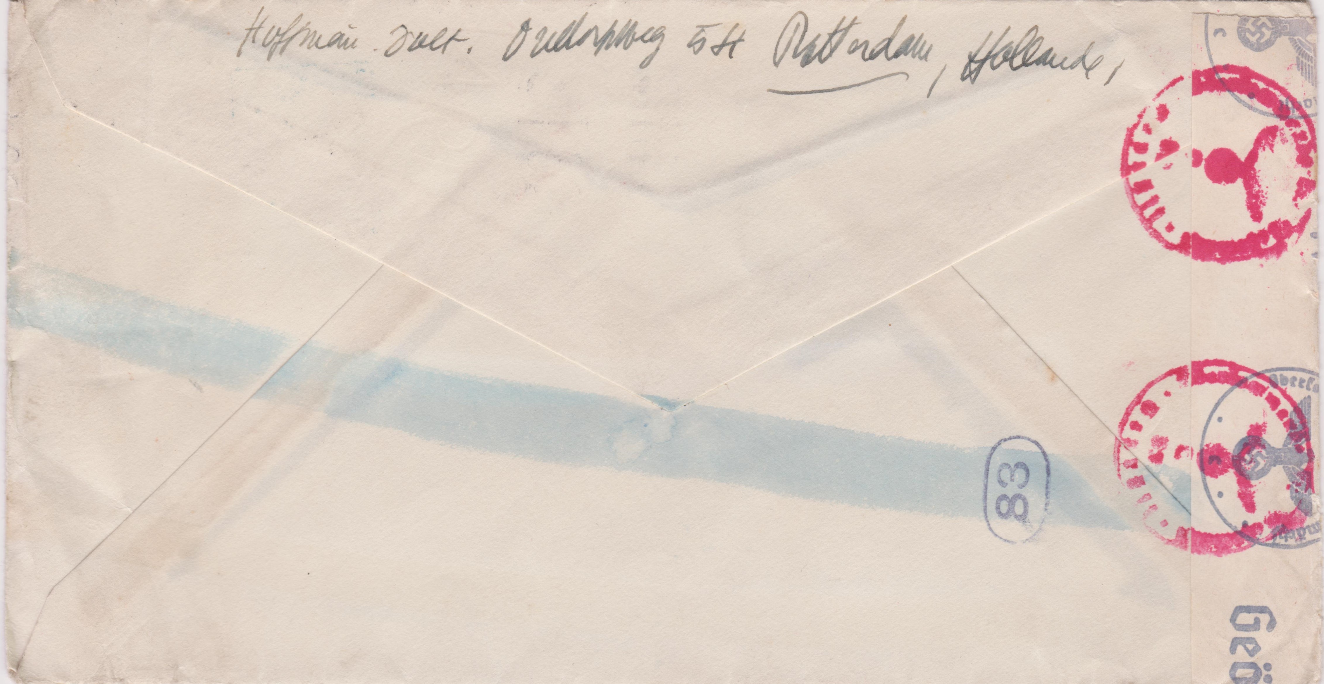Der Brief lief durch die ABP Köln, wo er linksseitig geöffnet und nach erfolgter Prüfung mit einem Verschlußstreifen, Landsmann CV3.2, wiederverschlossen wurde, was rückseitig ein Maschinenstemelabschlag, Landsmann CPM1.1, in Rot dokumentiert.