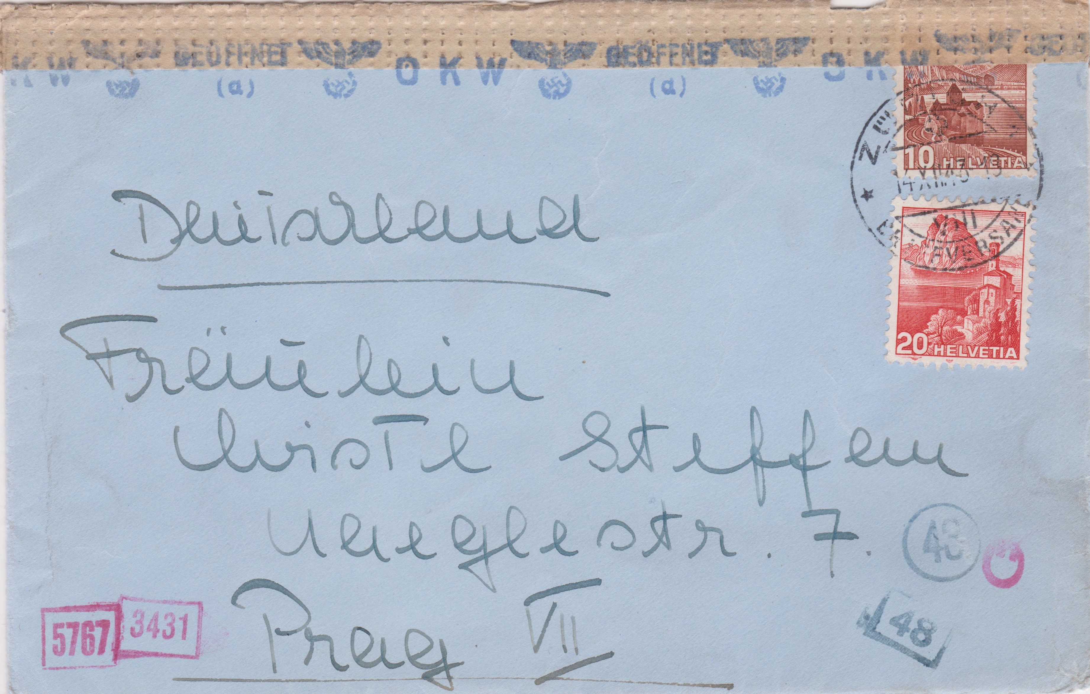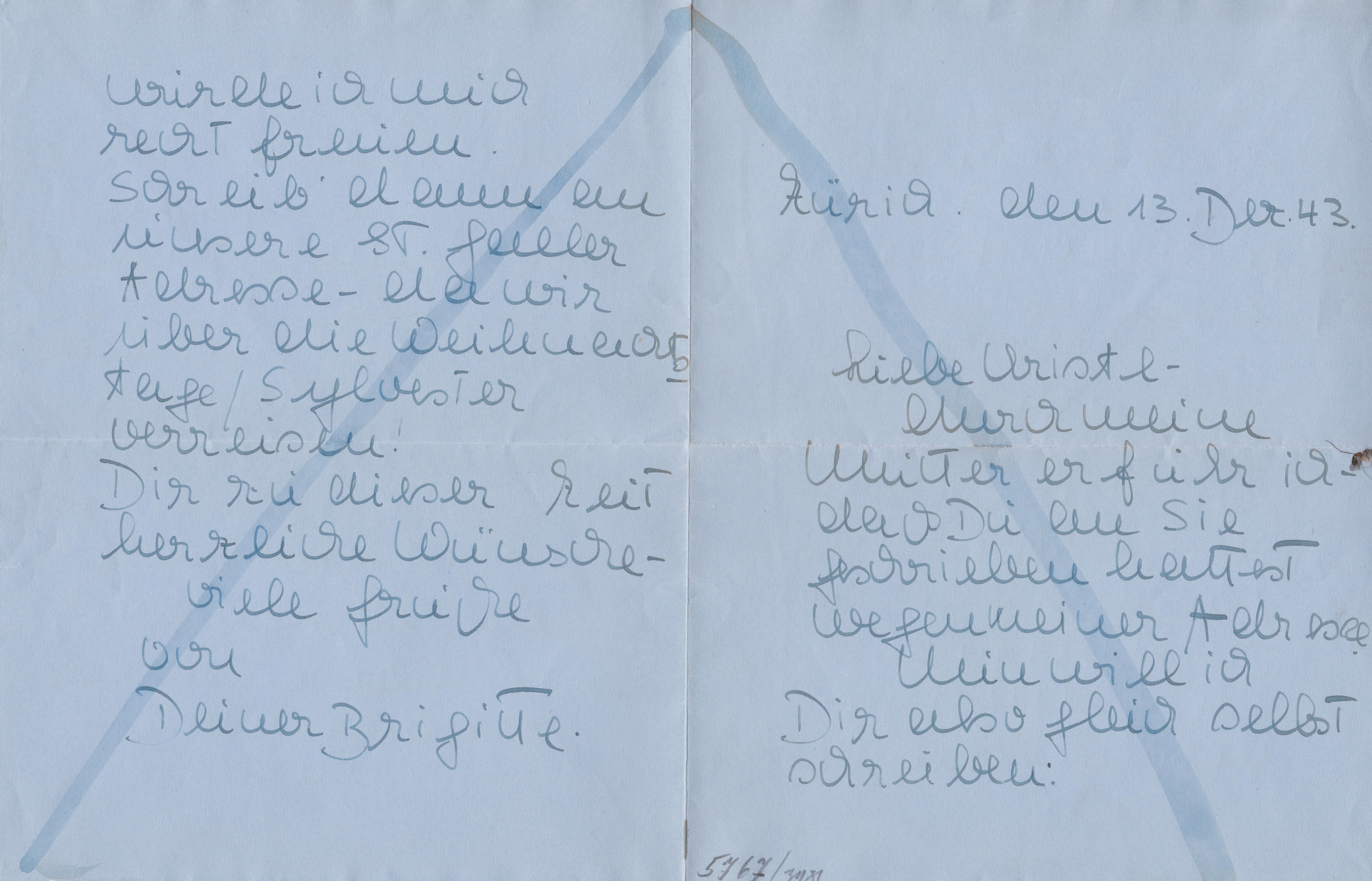 Brief nach Prag, geschrieben am 13.12.1943 in Zürich, aufgegeben am 14.12.1943: