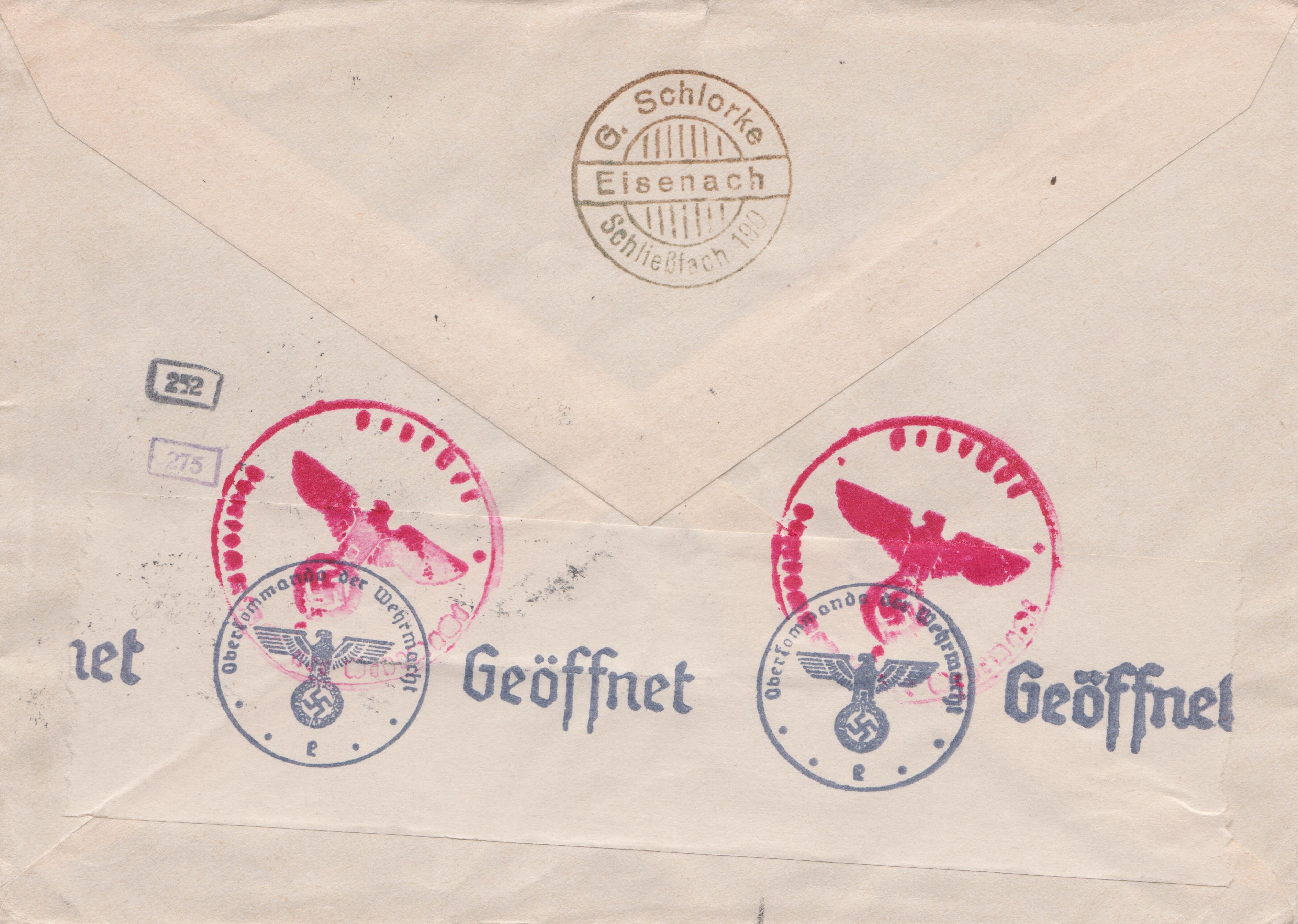 In der ABP München wurde dieser Beleg oben geöffnet und nach erfolgter Prüfung mit einem 20mm breiten hellbraunen Papierstreifen der Briefverschlußvorrichtung senkrecht geriffelt verschlossen, was ein Stempel der Briefverschlußvorrichtung "GEÖFFNET (d) OKW" dokumentiert.